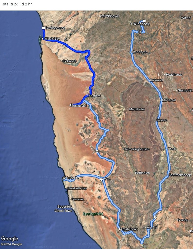 Northern part of the route, from Windhoek to Swakopmund: We will first travel to Etosha, where we will stay 2 nights in Okaukuejo and 2 nights in Dolomite camp. Then we’ll continue further southwest towards Twyfelfontain Adventure camp, passing Grootberg pass on the way, and maybe also Palmwag, if time permits and no tyres blows in the way (I think I’ll bring a tyre repair set with a compressor, as I’ve just learnt how to use it). After Twyfelfontain, where we’ll visit the 6000 years old rock engravings, we’ll pass the mining city Uis and slowly set course towards the ocean city of Swakopmund (if we do not get delayed by desert elephants in the Ugab or Huab rivers on the way). In Swakopmund, we’ll visit belowed friends, go to restaurants and swim in the Atlantic ocean.Southern part of the route, from Swakopmund to Windhoek: First we’ll pass Walvis Bay and continue to the sanddunes at Sossusvlei, where we’ll stay 2 nights at Sossusvlei Lodge. The gate into the dune area is closed at night, so to get a photo of the dunes at sunrise we’ll have to be at the gate at 6 in the morning. The next day we’ll drive further towards Aus, but has a hard struggle to decide on whether we should drive the extra miles on the beautiful sand road D707, alongside the desert or take time to visit the Duwisib castle, which I still not have seen. Then we’ll stay 3 nights in Klein Aus Vista to rest, watch the with wild horses, Oryxes and sandy hills and to visit Lüderitz and the deserted diamond city of Kolmanskop. We’ll continue southwards passing Rosh Pinah and will be driving along the Orange river towards Aussenkehr, Ai-Ais and Fish River Canyon, where we’ll spend 2 nights at the Canyon Lodge. The last long leg of the trip, towards the Windhoek area, will be on a tarred road. We wish to come as close as possible to the airport on the second last day, if something should happen with the car. If not it will give us a restful day by the pool at Auas safari Lodge in the end.