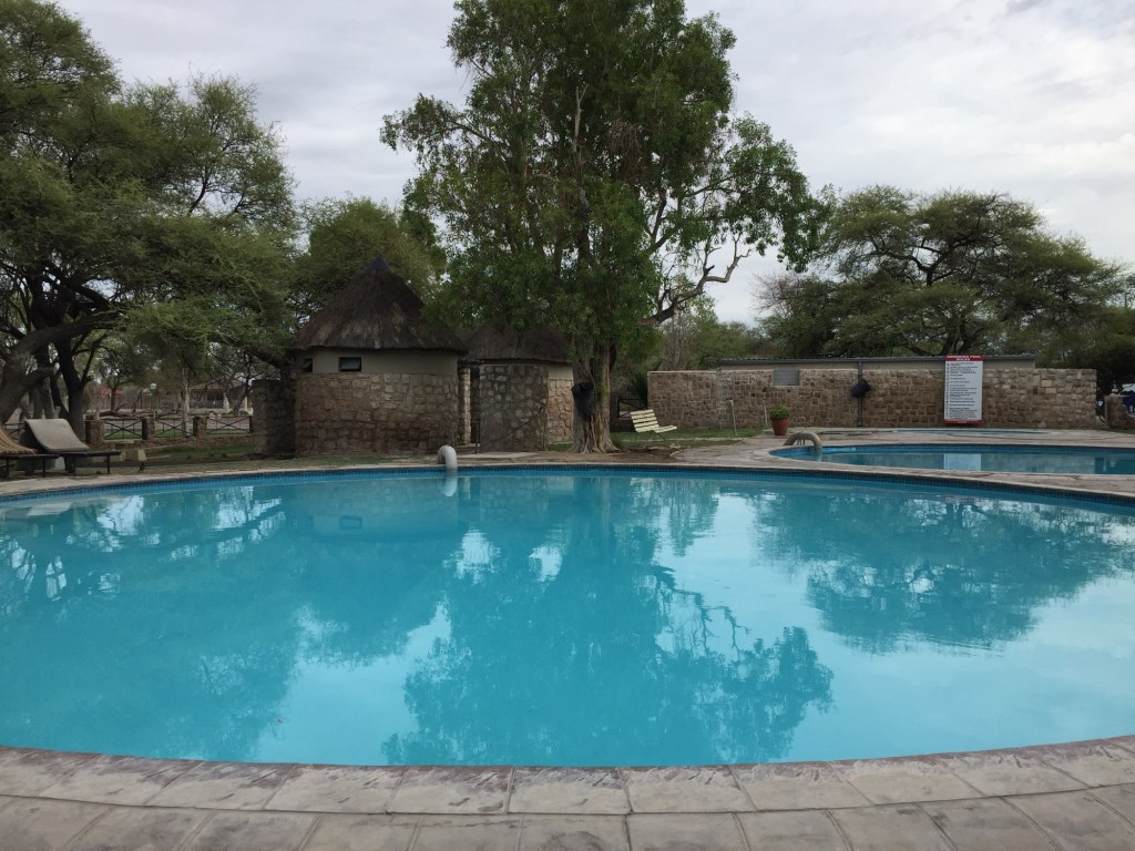 Halali is a very nice place to stop for lunch, as you will be able to swim in a large pool there. It is also less expensive than the other camps, but for game viewing in the night. Okaukuejo is much better.