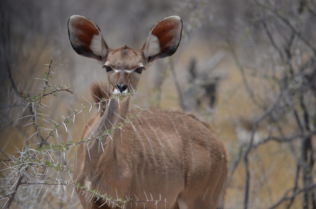 Other animals you will most likely see in Etosha is the cute springbok antilope, zebras, giraffes, elephants, implalas, bat-eared fox, gnu’s and possibly rhinos and lions, if you are lucky.