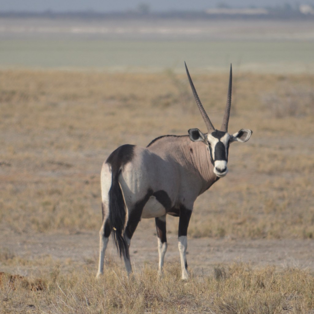 The clue to animal-spotting is all the waterholes, as the animals are seeking there to drink when it’s so dry elsewhere in the park. Many of the animals, are also adjusted to the dry climate, as the fascinating Gemsbok (Oryx Gasella), with its long spear-like horns and black/white face, that can survive for days without water, getting needed moisture from grasses and plants. Oryx have an unusual circulation system in their head. They are able to cool the blood flowing to their brain through the capillaries in their nose as they breathe. They may also raise the temperature of their body to 45 degrees Celsius. This causes heat to leave their body for the surrounding cooler air, rather than losing moisture through sweating or evaporation.