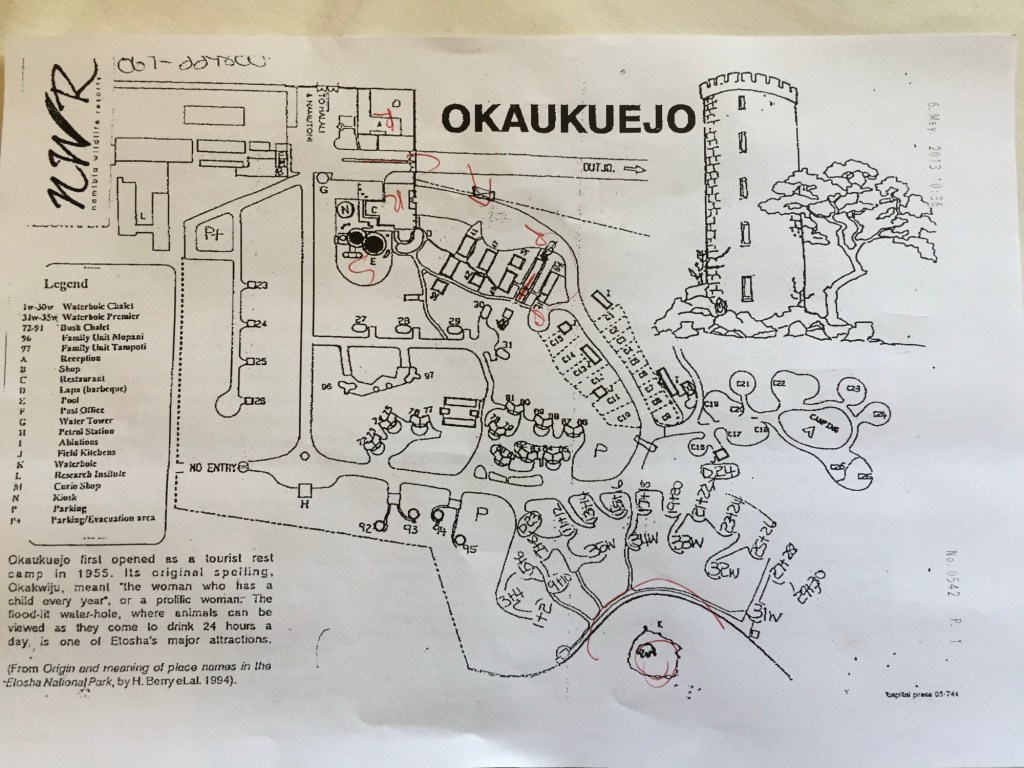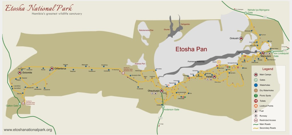 The 3 bigger camps in Etosha (going east to west, on the southern side of the pan) is Namutoni, Halali and Okaukuejo. North of Namutoni, there is a newer camp called Onkoshi and far west there is a camp called Dolomite. There is also a campground in the western part, called Olifantrus.
