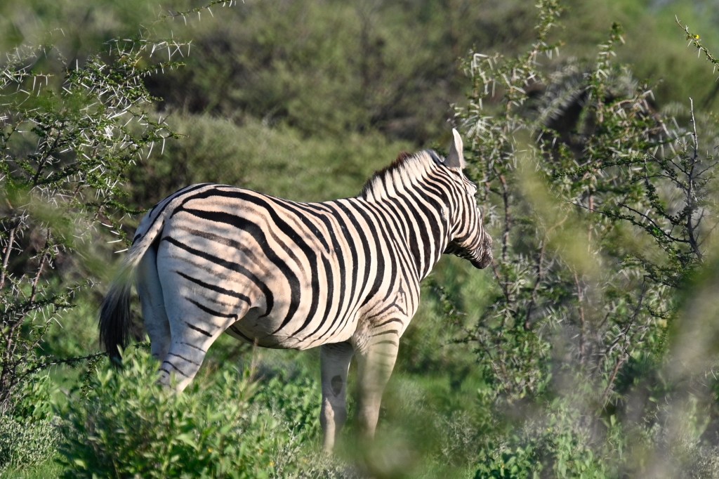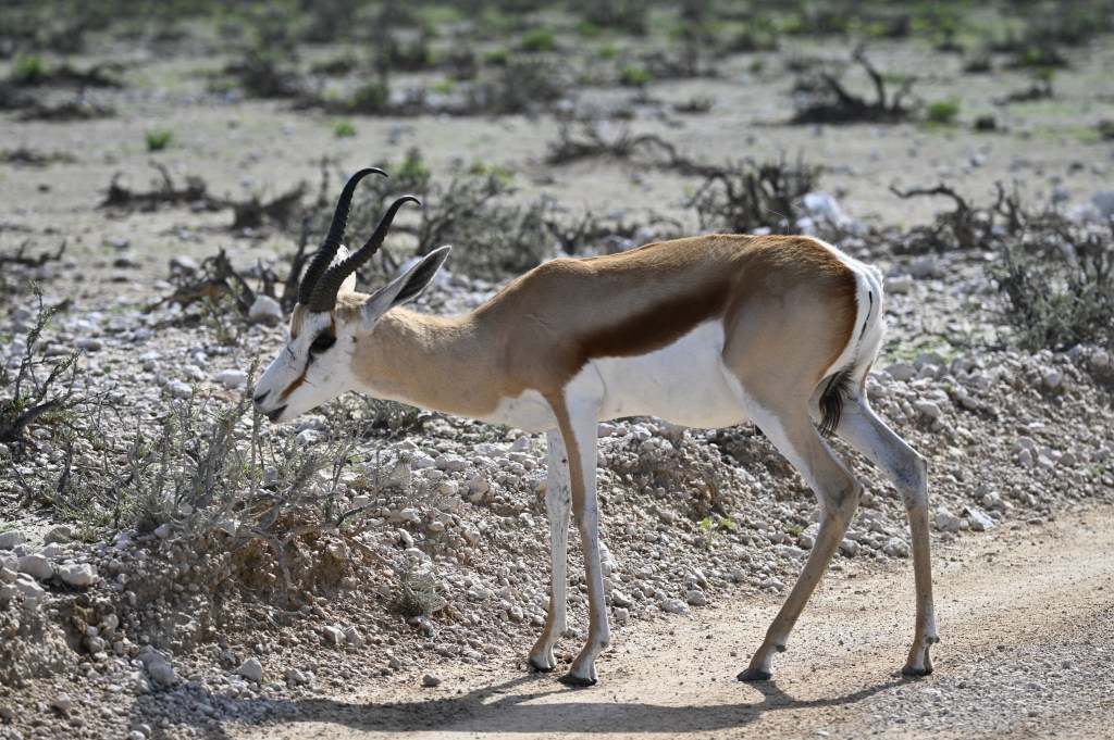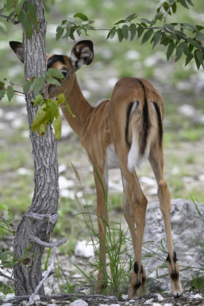 We have never seen much wildlife at the Halali waterhole, but the surrounding area is covered with more trees than in Okaukuejo, so lots of animals can usually be seen. Halali lay east of Okaukuejo and we took quite some time to drive there, due to rocky roads, with water on, and stopping several places to look if we could see any animals.
