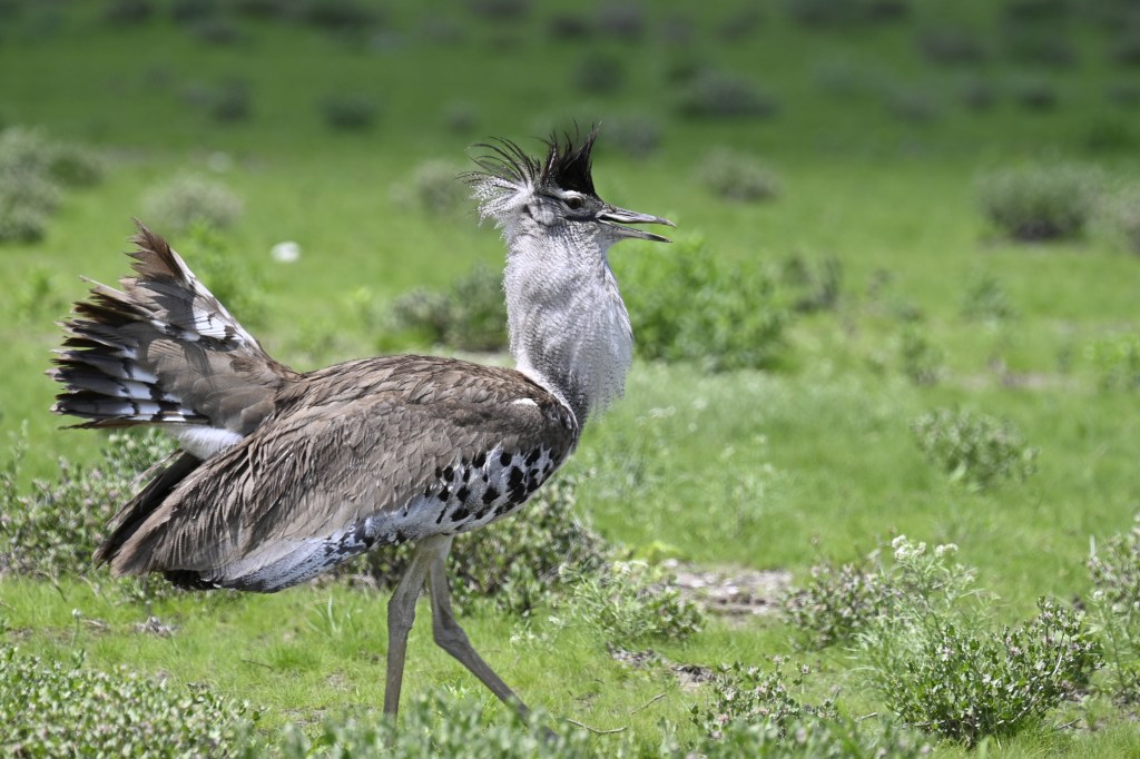 We saw some animals, but not the large herds as we used to do. We saw impalas and a giraffe and lots of butterflies and flowers. We also met a large bird, a Kori bustard, which seemed to be looking for ladies as he had fluffed up his feathers more than we have seen before. On the way back we saw some springbucks, a stenbuck, red heartbeast, blue wildebeast, zebras and a hawk. The view of the white Etosha pan, which at parts was covered with water was also spectacular.