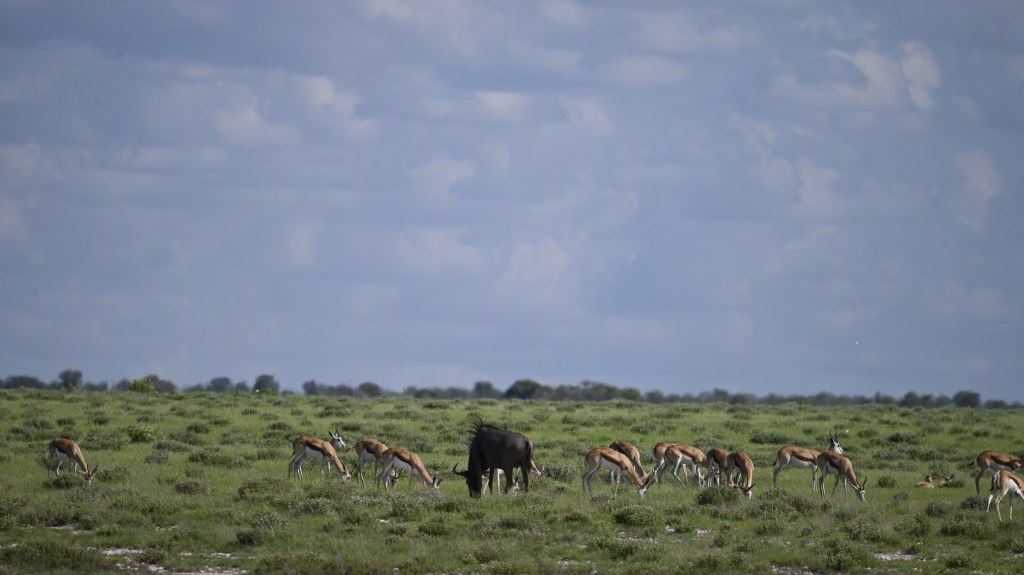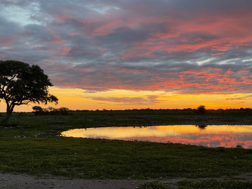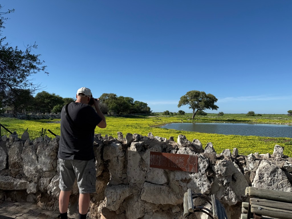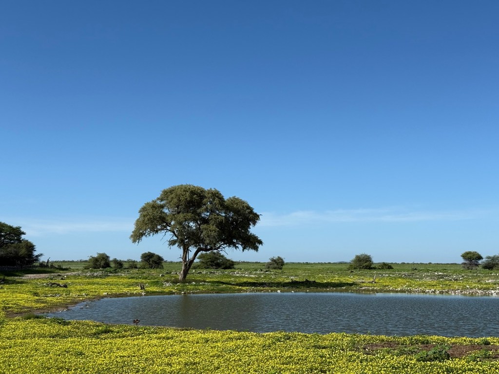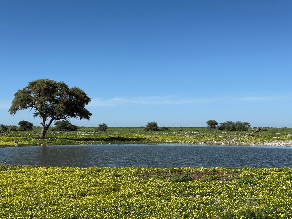 Okaukuejo was covered with grass and yellow flowers, quite unlike the white rocky terrain I knew from before. One of the park guards was so proud of how beautiful it all looked and told me to take photos so that I could tell the world how beautiful it now had become.