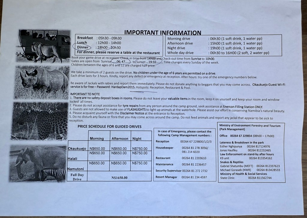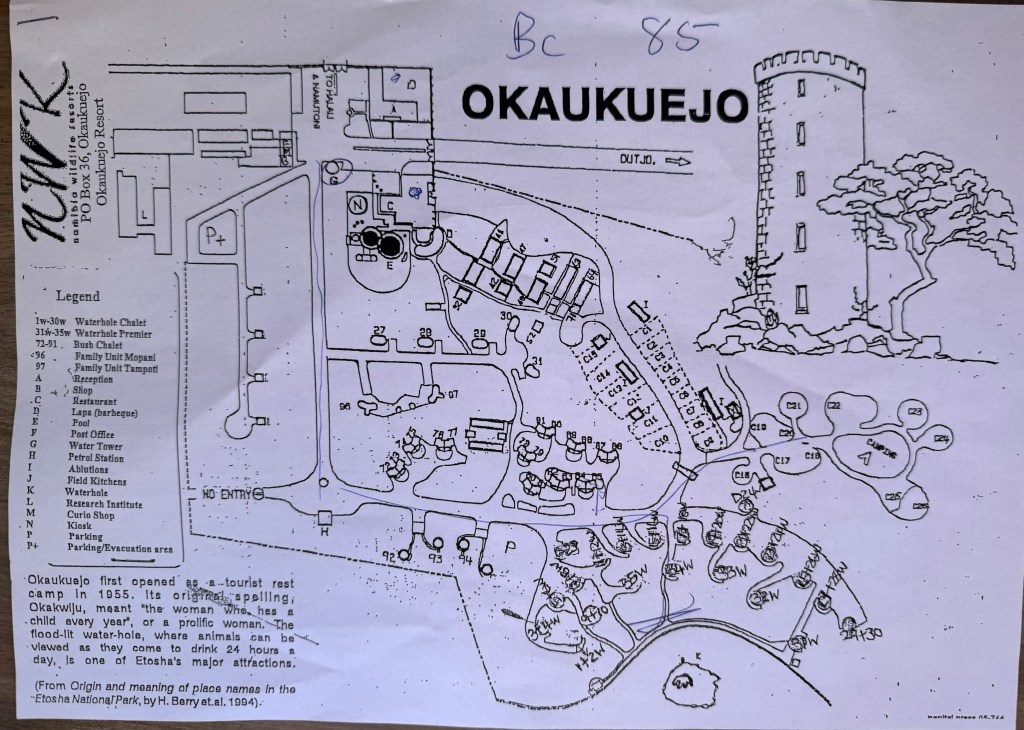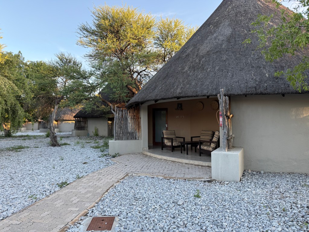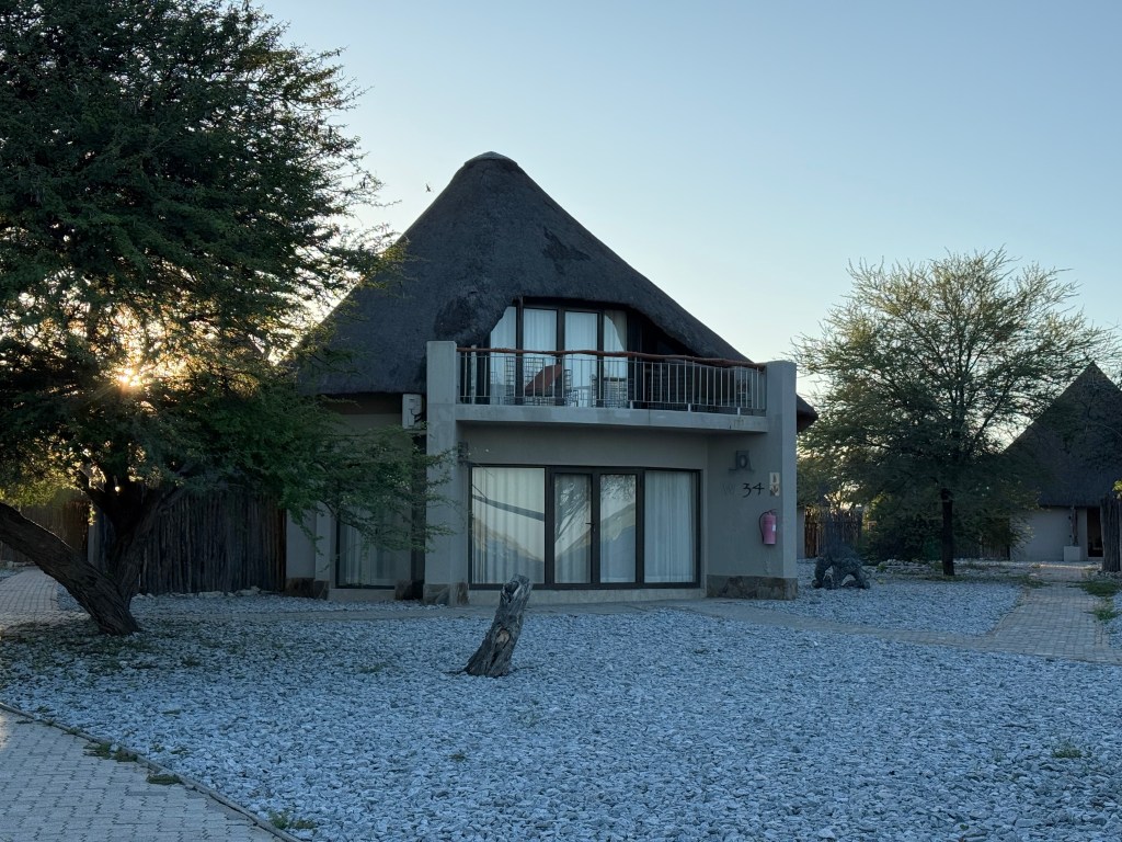 Inside Okaukuejo, you have several accommodation options, you can camp, live in double rooms, bush chalets, waterhole chalets or premium waterhole chalets, with two floors and which gives you a very good view of the waterholes. The premium is much more expensive, especially if you are not from Namibia or one of the SADC countries, so this time we went with a bush chalet, which was totally fine. In the bush chalet we had a small barbecue, which we used once, and that gave us a nice options to study the night stars.