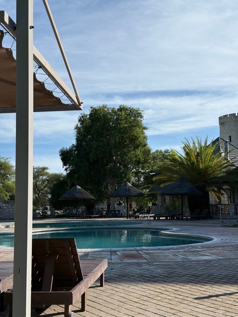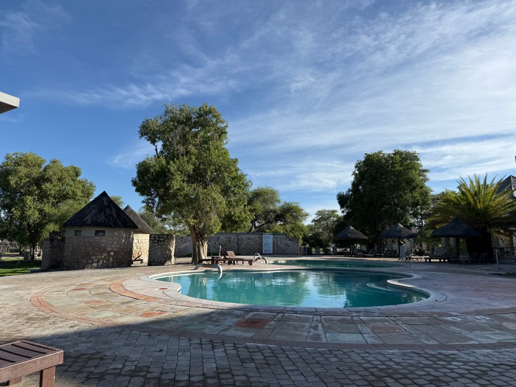 The camp has a beautiful swimming pool, a small grocery shop, a petrol station and a tower that you can climb to get a view of the area. At sunset each night, they close the gate, so no wild animals can enter where you stay. All the camps inside the park is run by Namibian Wildlife Resorts (NWR) and you can book accommodation through the NWR website.