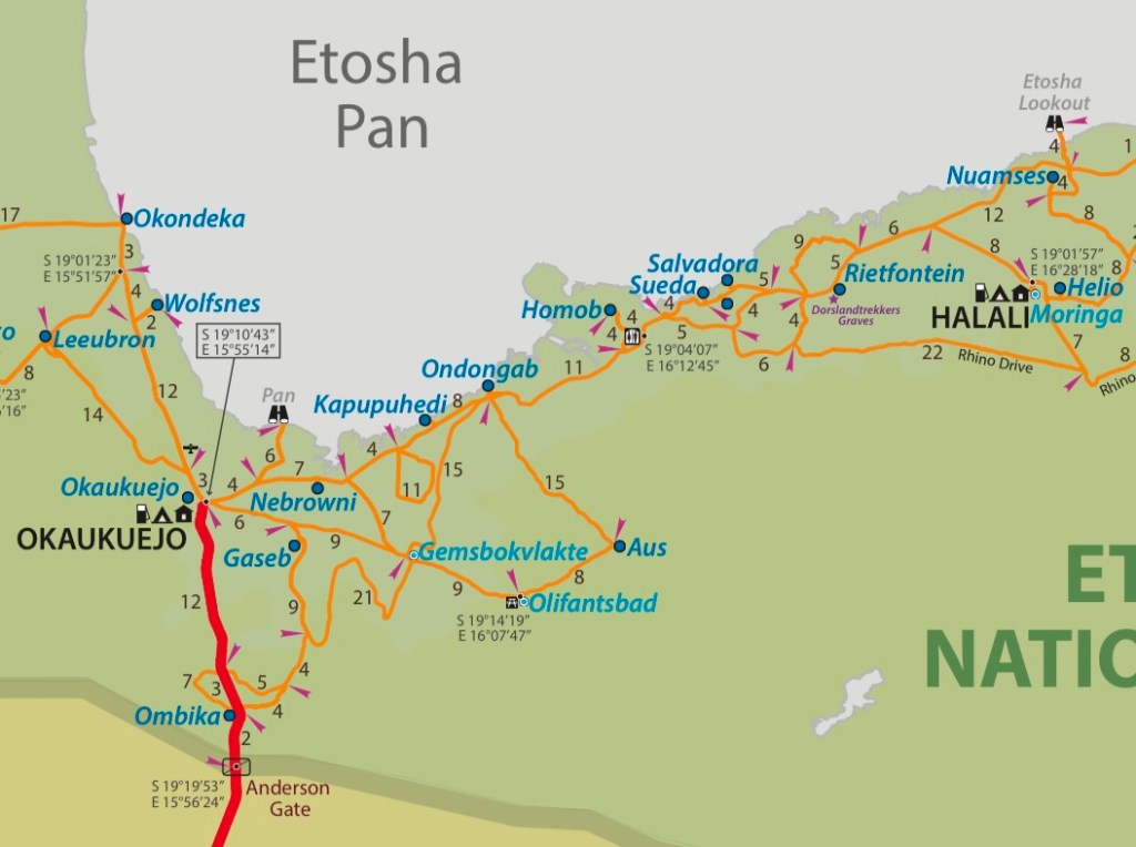 Okaukuejo is my favourite camp in Etosha National park. Its large waterhole is floodlighted at night and it is usually full of different animals coming in turns to drink. You can follow the Okaukuejo live-view webcam to see what is going on there throughout day and night.