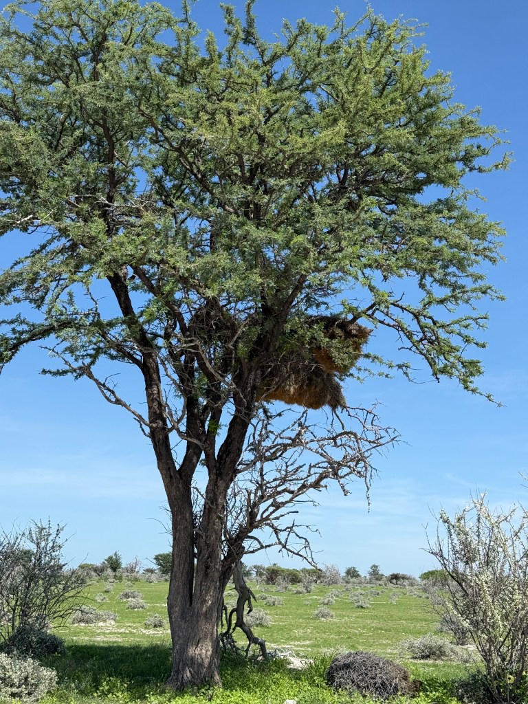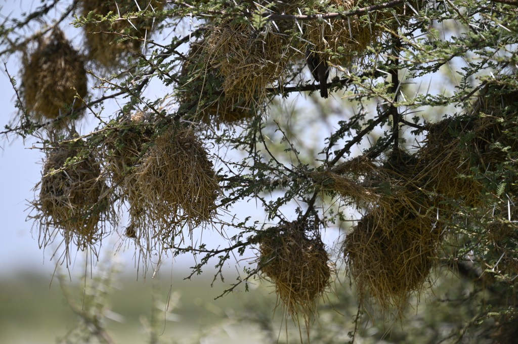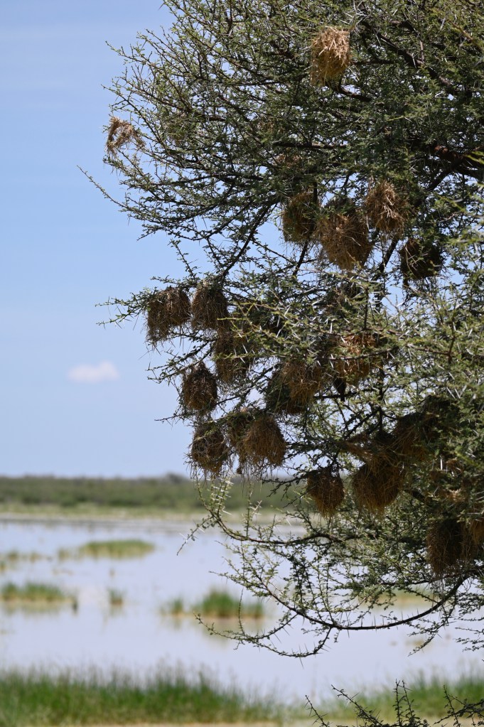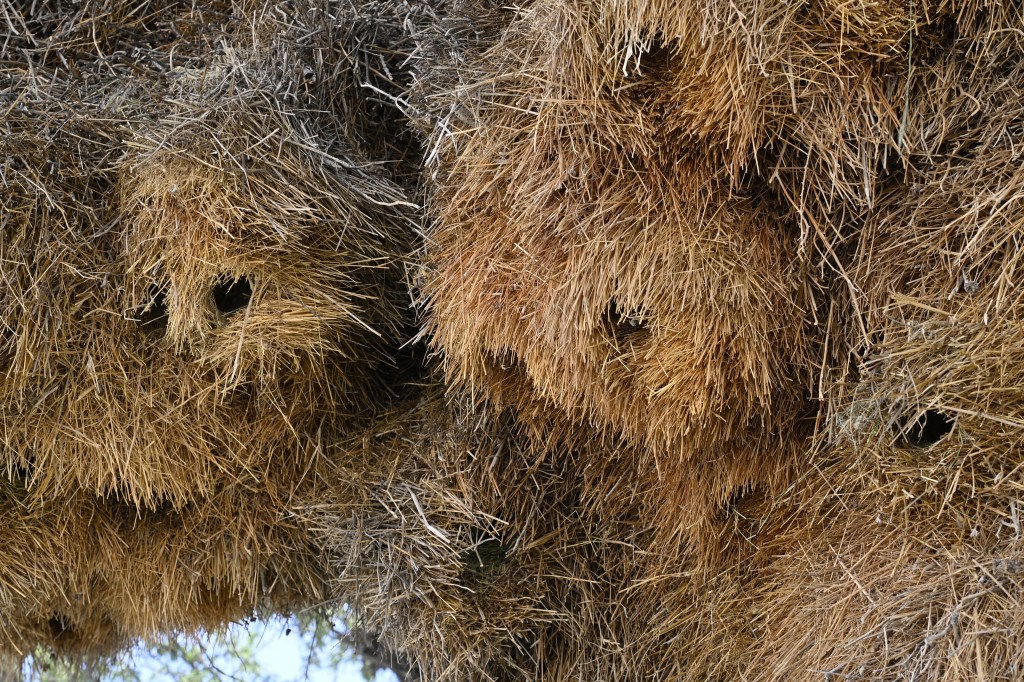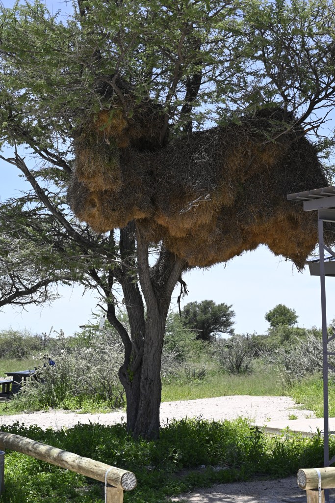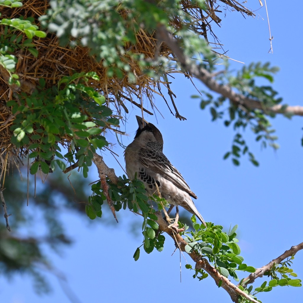 Travelling in Namibia, you will see birds nests in many of the trees as well as in the electricity poles. Some weaver birds builds enormous compounds of nests, where there may live large amounts of birds in one enormous nest, with many openings. The grey/brown birds inhabiting these nests is called the Sociable weaver.