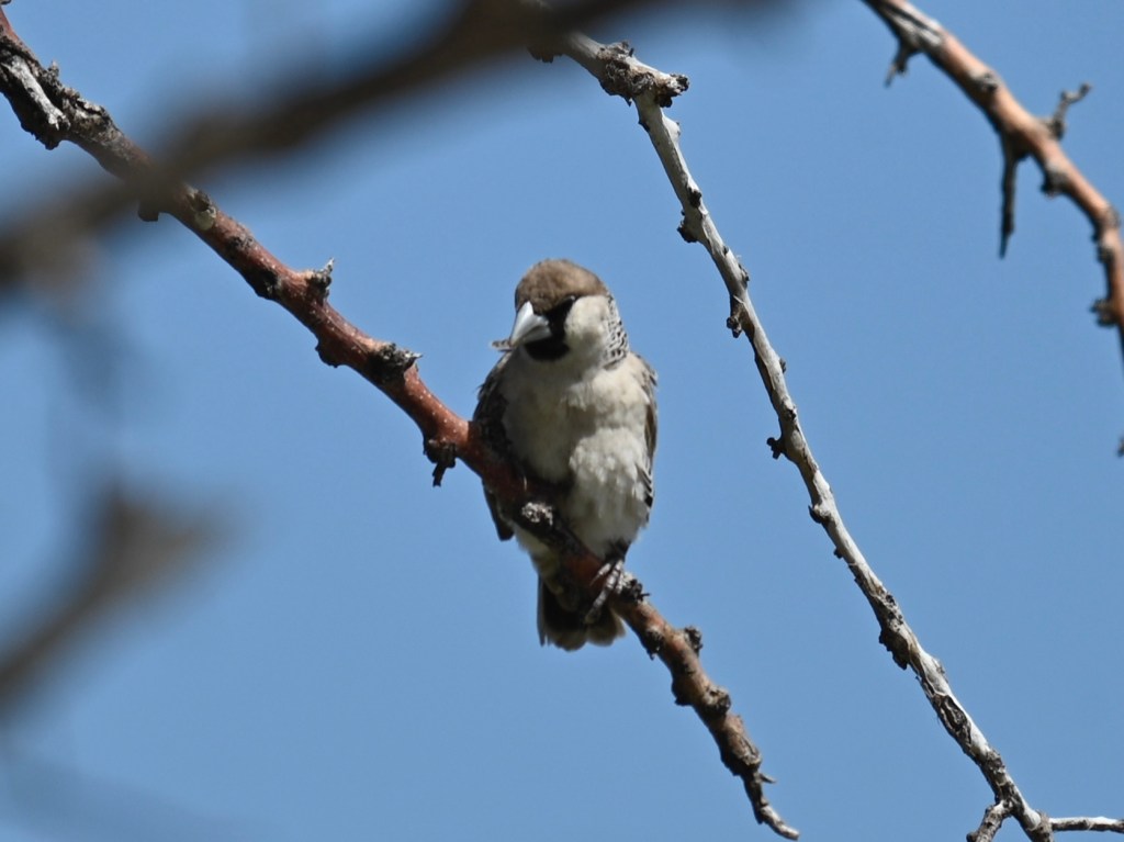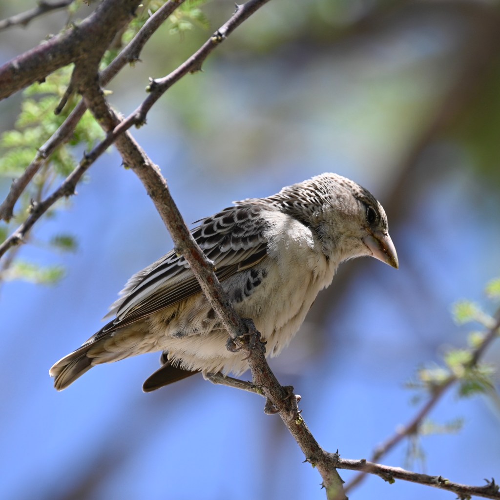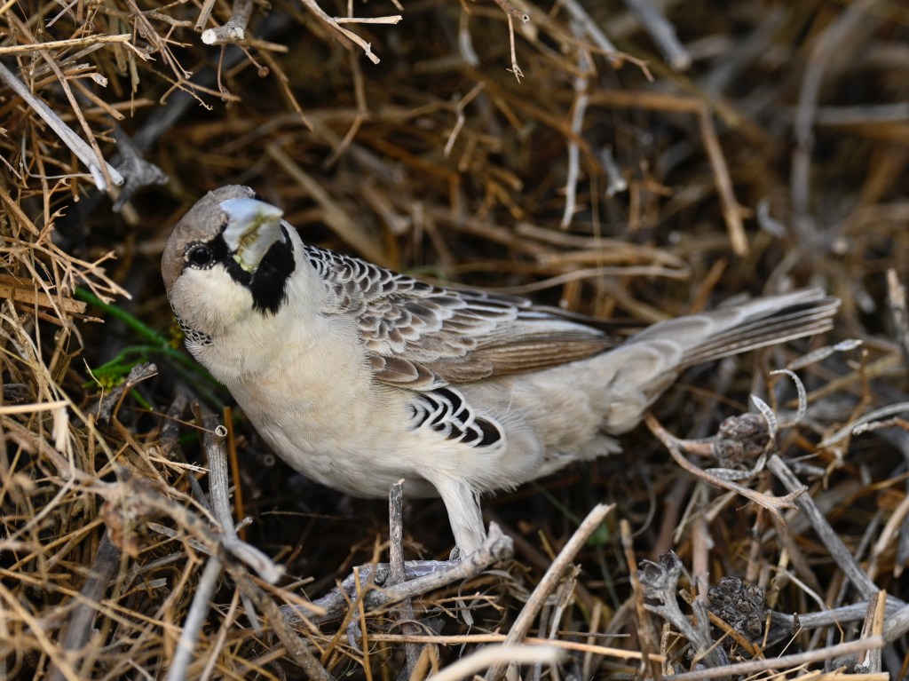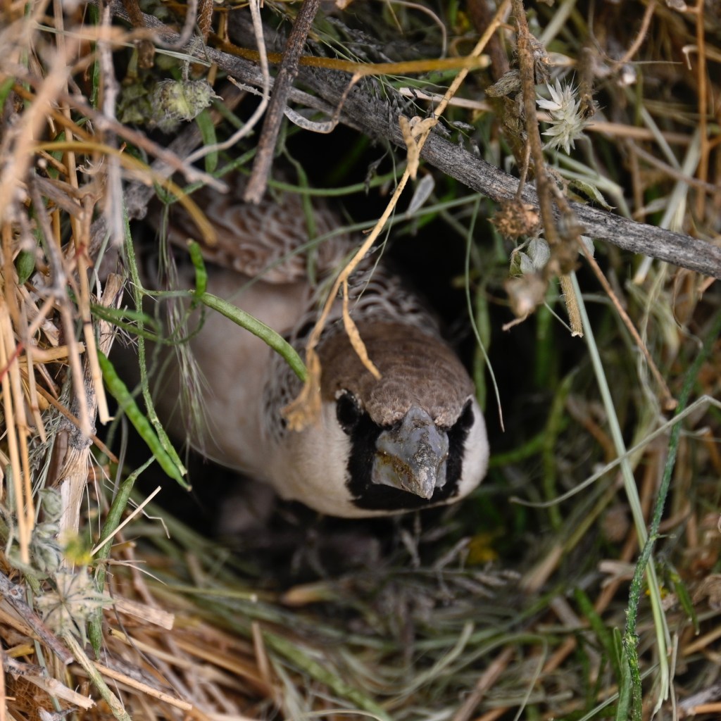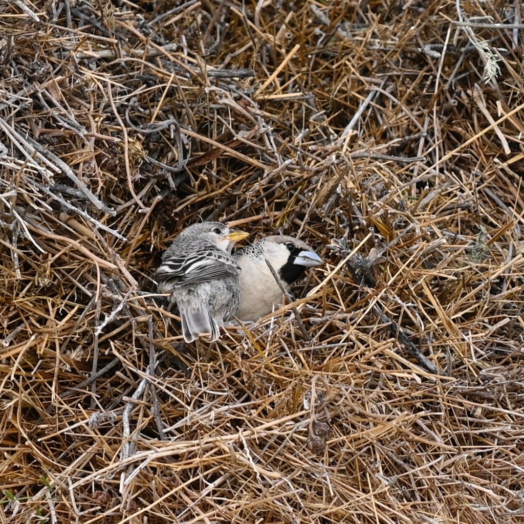 Travelling in Namibia, you will see birds nests in many of the trees as well as in the electricity poles. Some weaver birds builds enormous compounds of nests, where there may live large amounts of birds in one enormous nest, with many openings. The grey/brown birds inhabiting these nests is called the Sociable weaver.