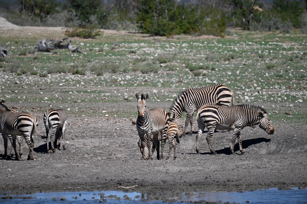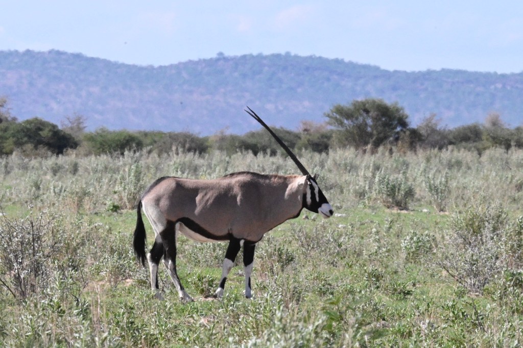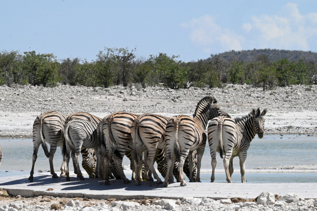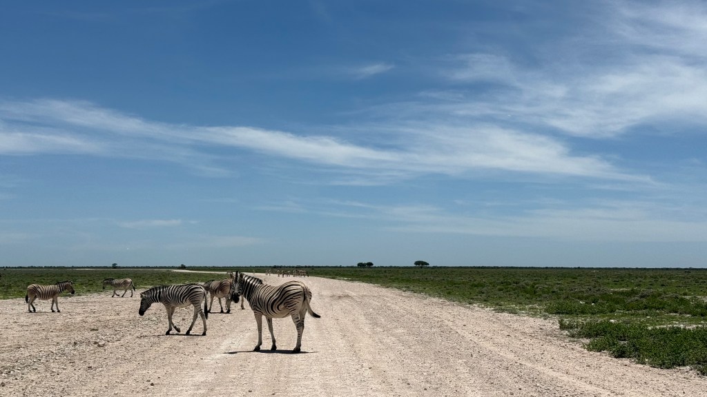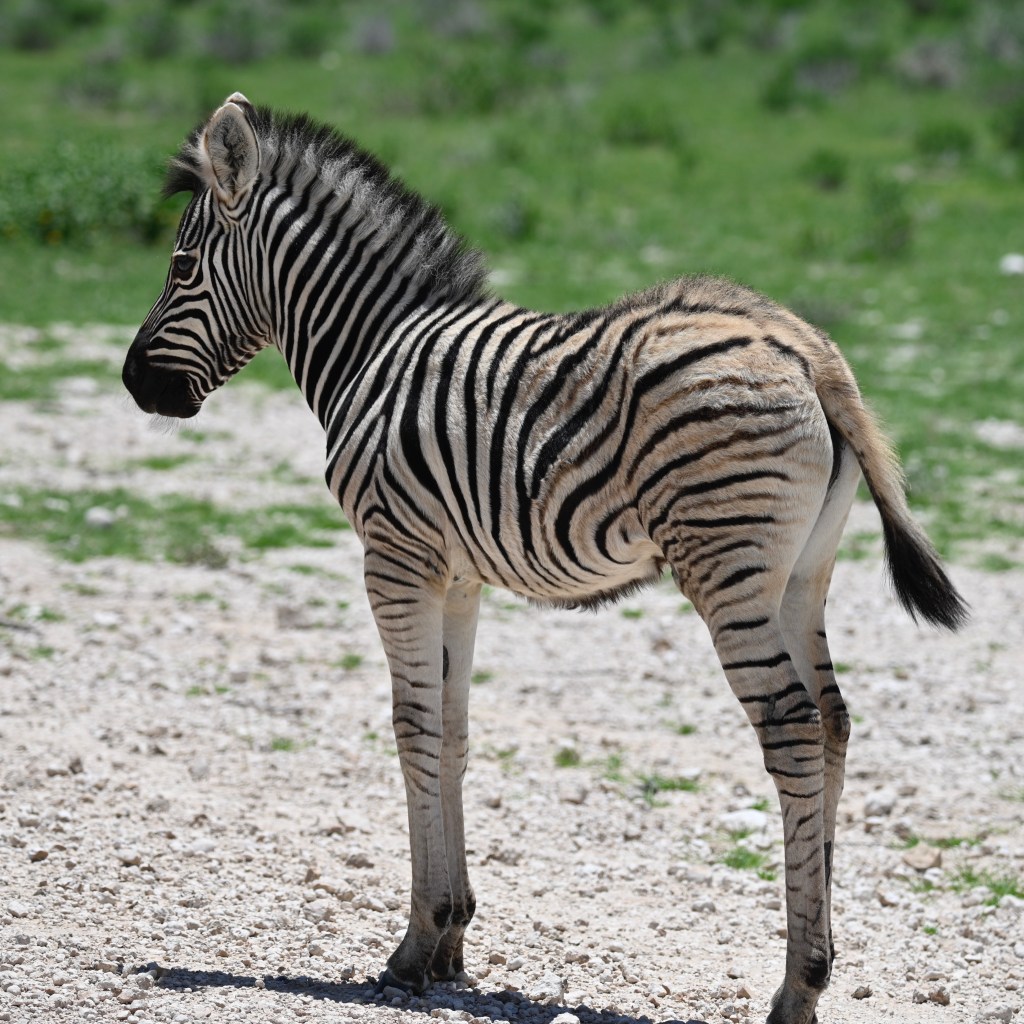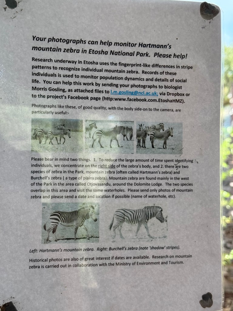We encountered two different Zebra species in western Etosha. The regular plains Zebra and the more vulnerable Hartmann’s mountain Zebra. The latter one we met southwest of Dolomite camp. It is recognised by its stripes not crossing underneath its belly and by not having the thinner greyish stripes in-between the black and white. When looking at pictures, they also seemed to have shorter legs. We didn’t understand it at the time we encountered them, but at the camp, we had seen a poster asking visitors to help in a research project to register mountain zebras. When looking at that, we realised that we had seen something rare.