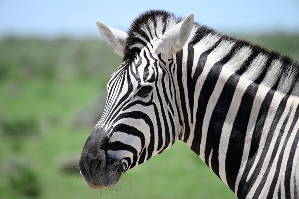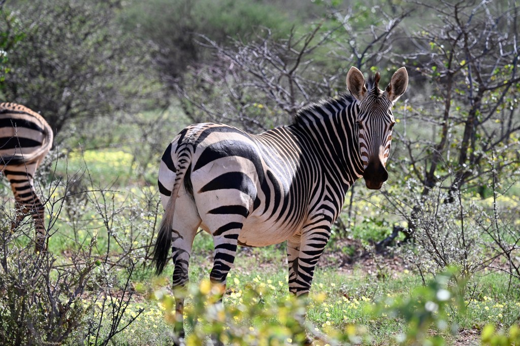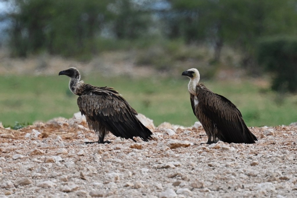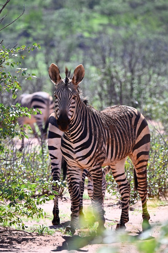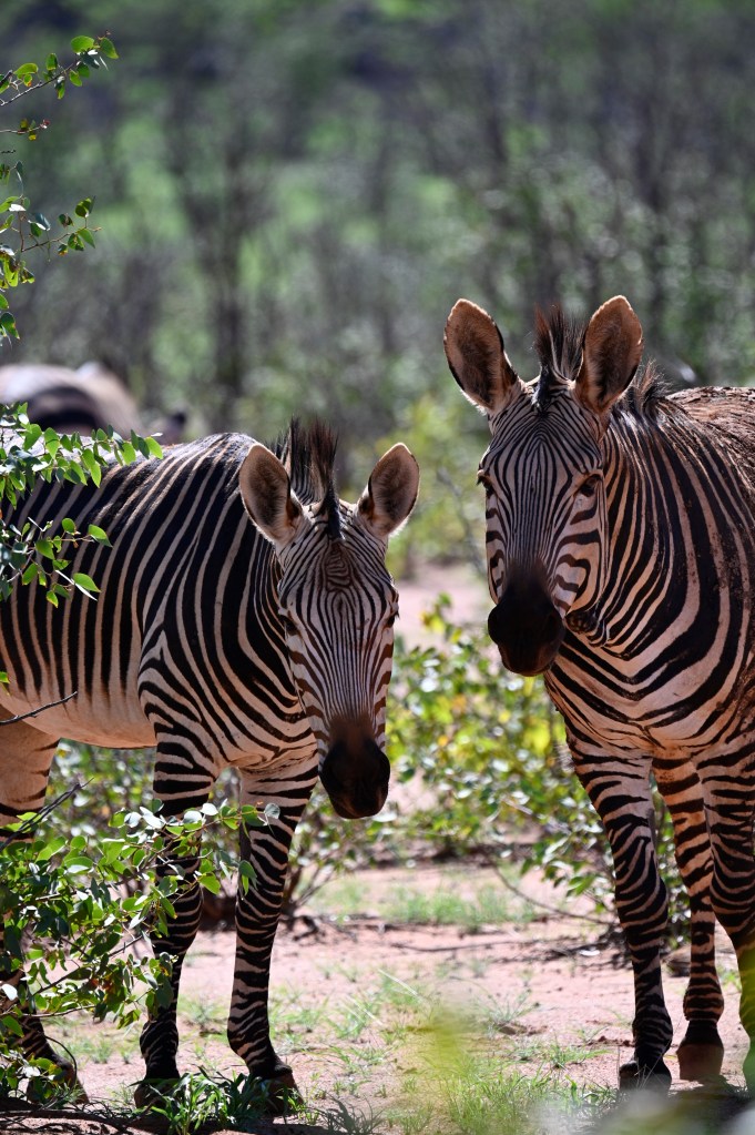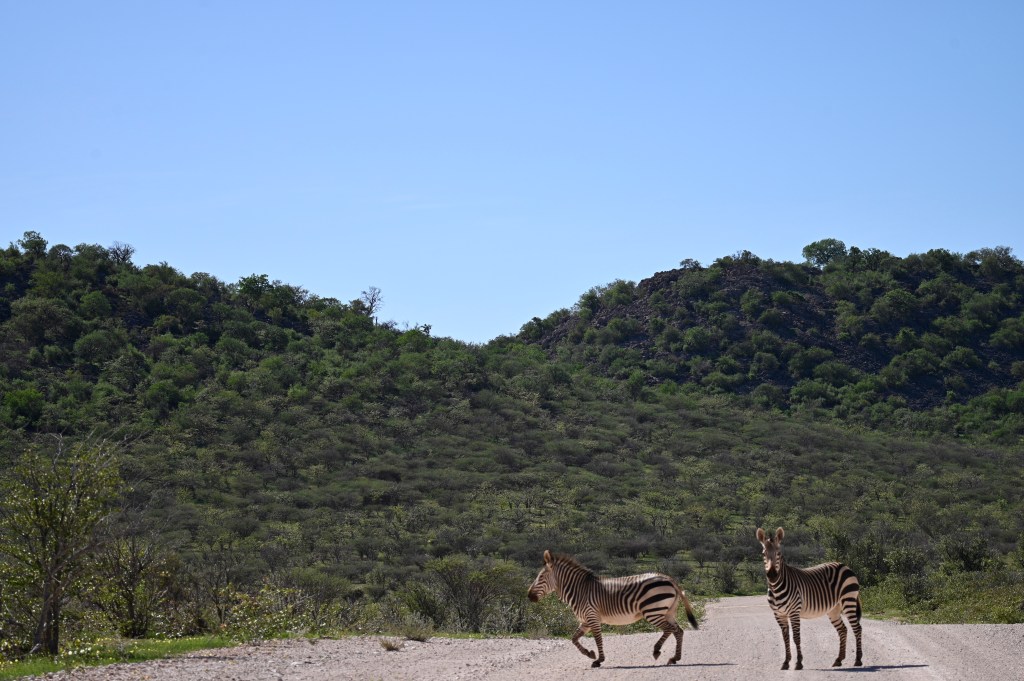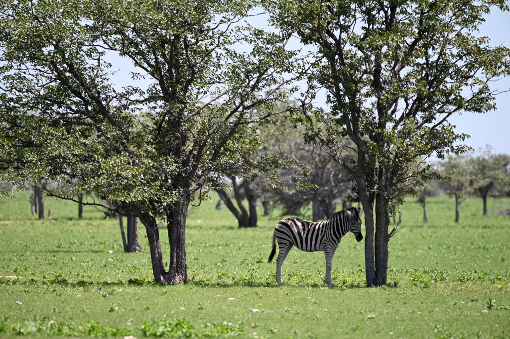 We encountered two different Zebra species in western Etosha. The regular plains Zebra and the more vulnerable Hartmann’s mountain Zebra. The latter one we met southwest of Dolomite camp. It is recognised by its stripes not crossing underneath its belly and by not having the thinner greyish stripes in-between the black and white. When looking at pictures, they also seemed to have shorter legs. We didn’t understand it at the time we encountered them, but at the camp, we had seen a poster asking visitors to help in a research project to register mountain zebras. When looking at that, we realised that we had seen something rare.