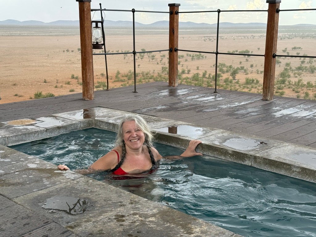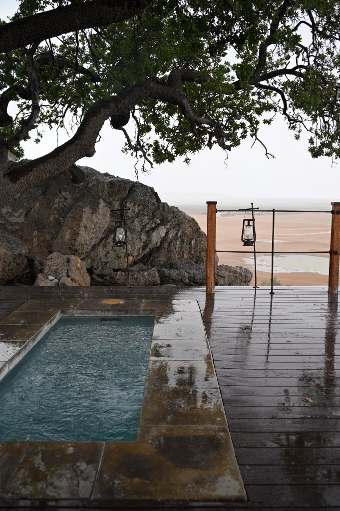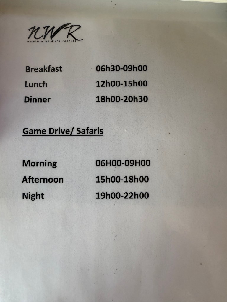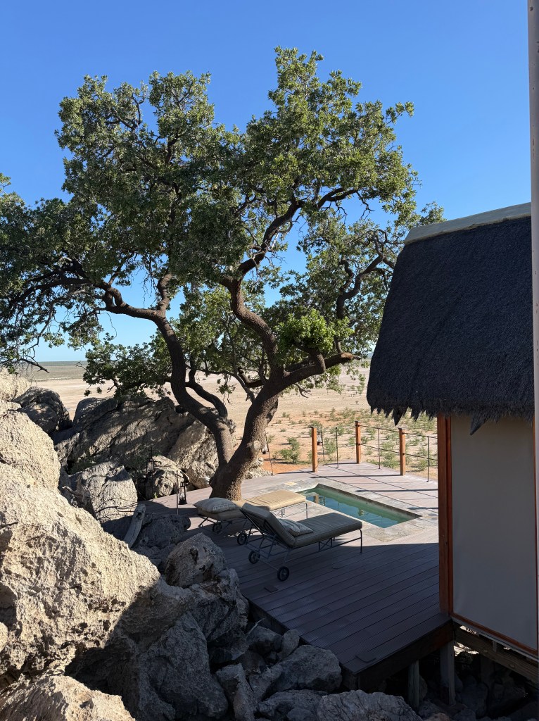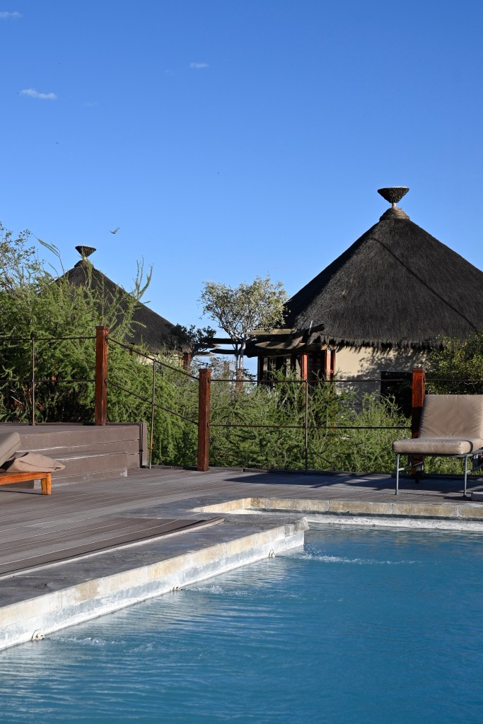 Dolomite was such a treat! We lived in a de-luxe chalet with our own private plunge pool and view over the waterhole from our two balconies. It was the cabin furthest away from the reception, restaurant and main pool area, but a small “golf-car” picked us and our luggage up at he parking, a little down-hill and drove it to our cabin. It also drove us home in the evening, when it was too dark to walk home. There are no fences in Dolomite camp, so it may be wise not to walk home alone in the dark, with night-active animals around.