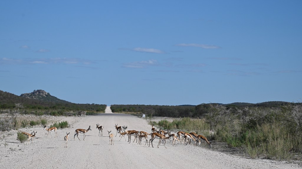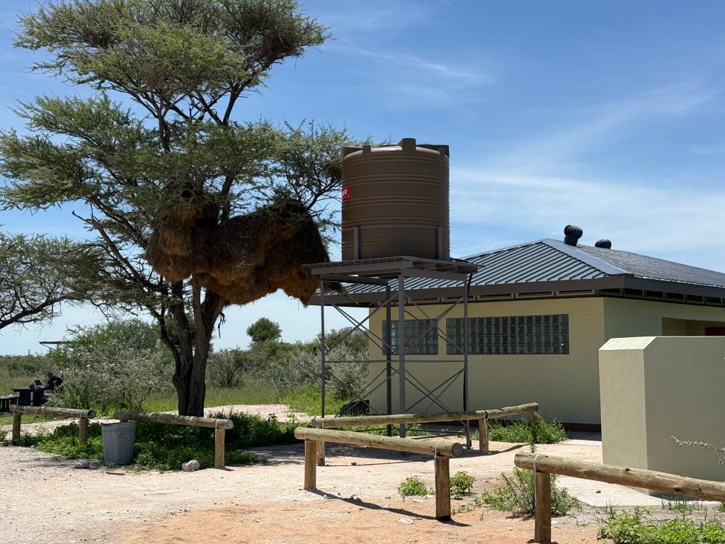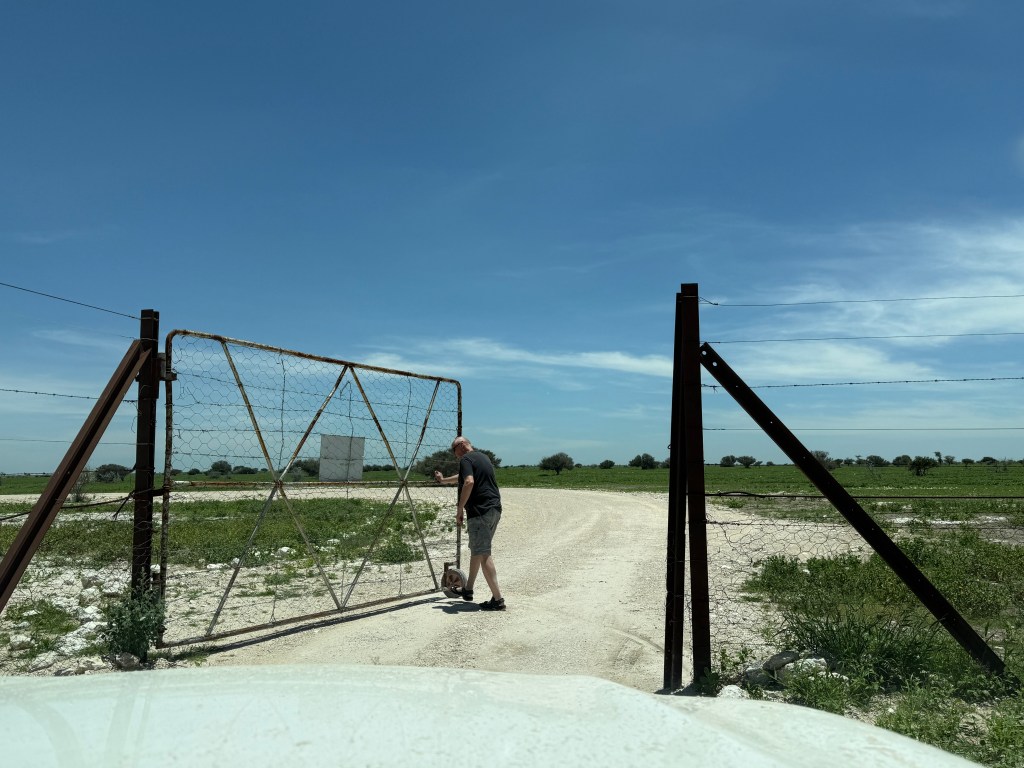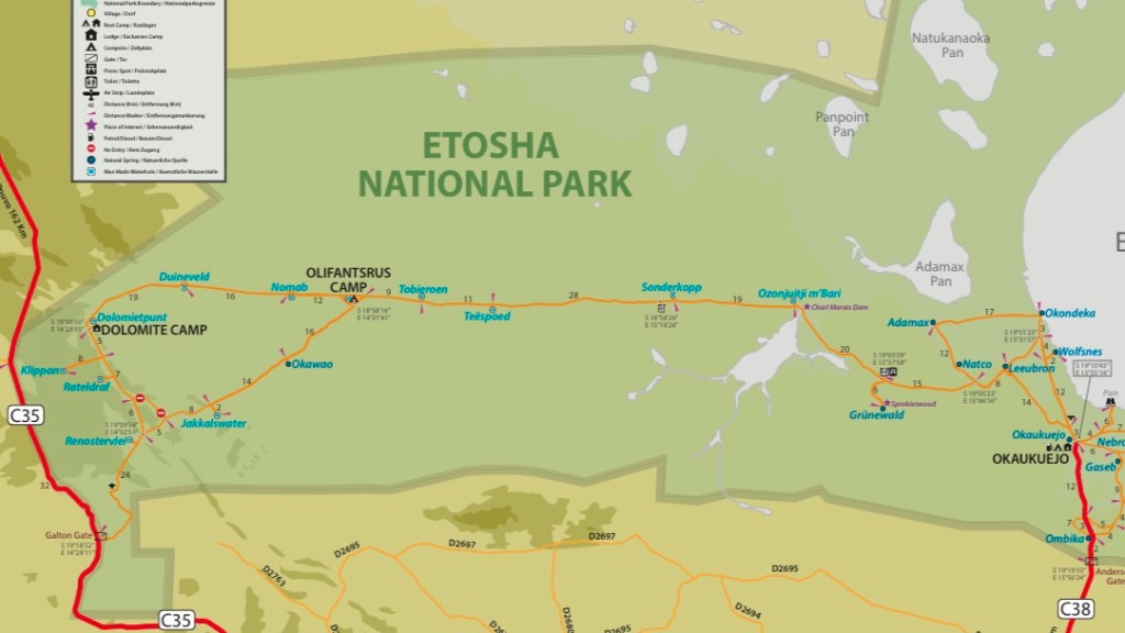 As there are wild and dangerous animals in Etosha, you cannot leave your car whenever you need a break. As the travel between Okaukuejo and Dolomite takes many hours, you should plan stops wherever possible and bring water and food in your car. We found a fenced rest stop at Sonderklopp, where one of us needed to quickly leave the car and open the gate to let the car in and then close it again before any lions could get us. Inside the fence we could walk freely around. The toilet was not working, but there were plenty of trees and bushes giving some hide.
