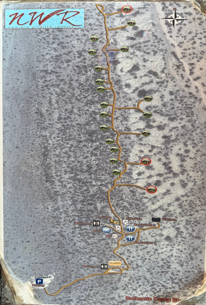 We found a fenced rest stop at Sonderkopp and a waterhole viewpoint and a sandwich at Olifantsrus camp. Otherwise we were on the road most of the day, before reaching Dolomite resort around 17:00.