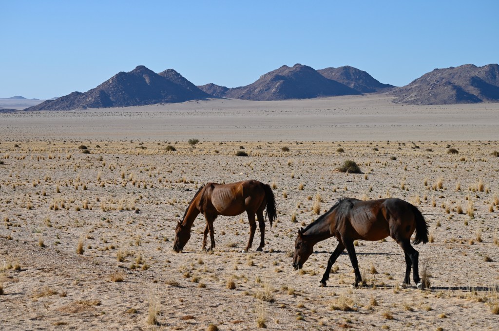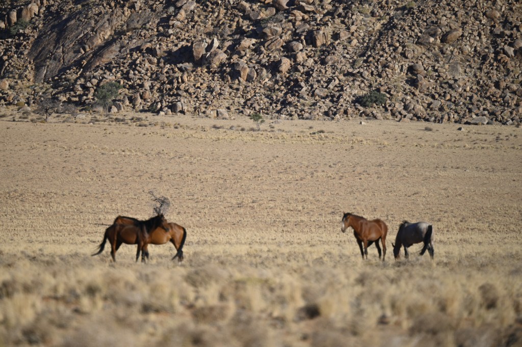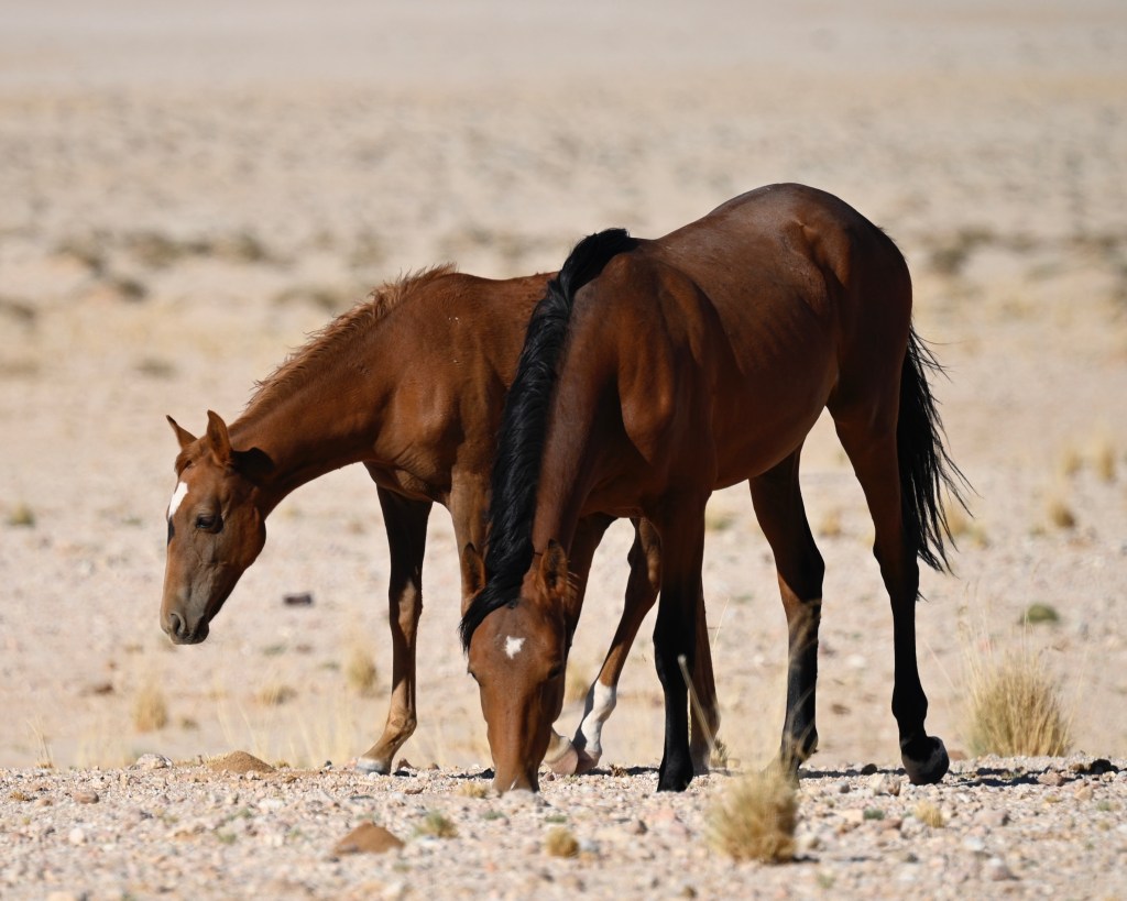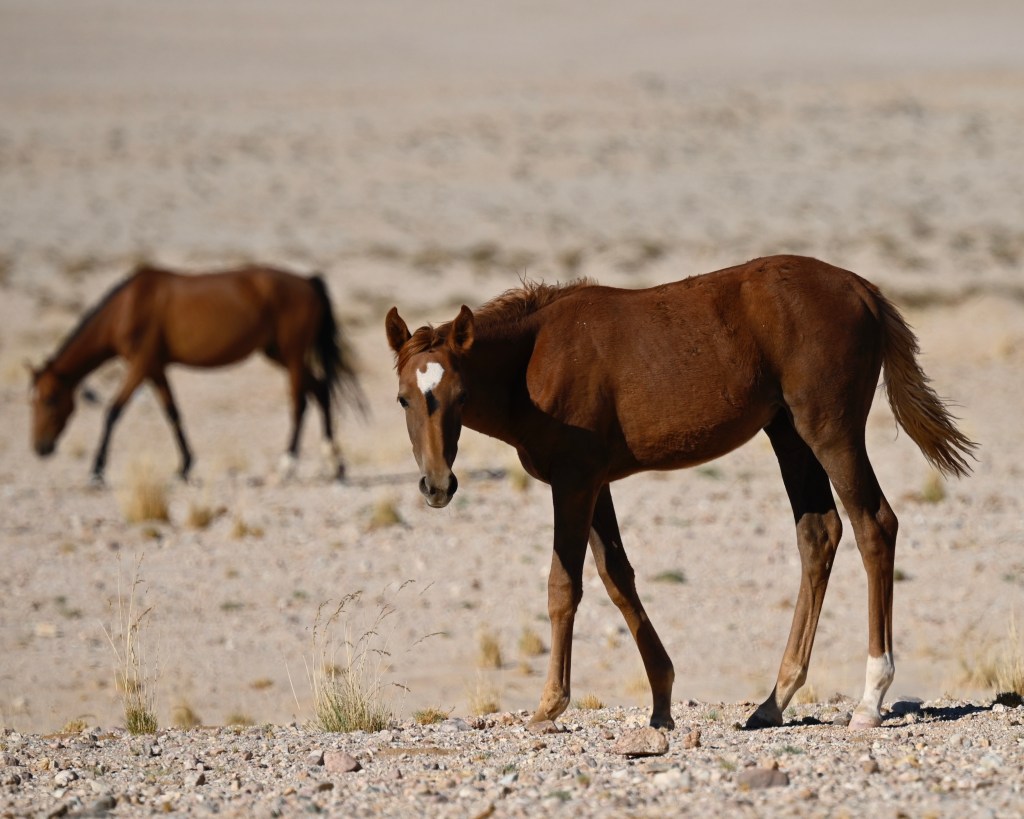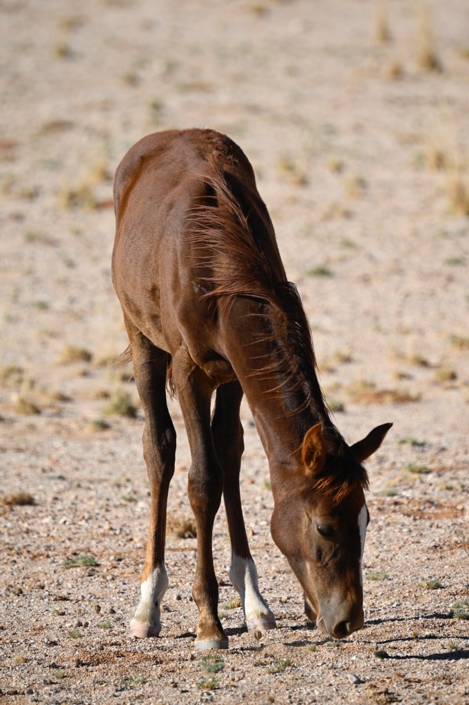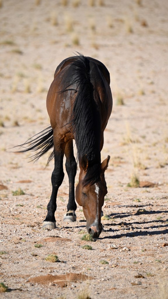 In the southern part of the Namib desert, around Aus, you will find herds of wild horses. Horses would not normally reside in areas with such a dry and warm climate, so they must be imported from somewhere but stories as to where they come from are diverse. The stories range from those about a baron at Duwisib castle, from diamond explorations and to being imported as war horses. Anyway, have the horses survived the harsh conditions for more than a century, found their place and is beautiful to look at.