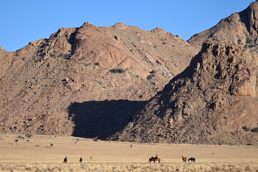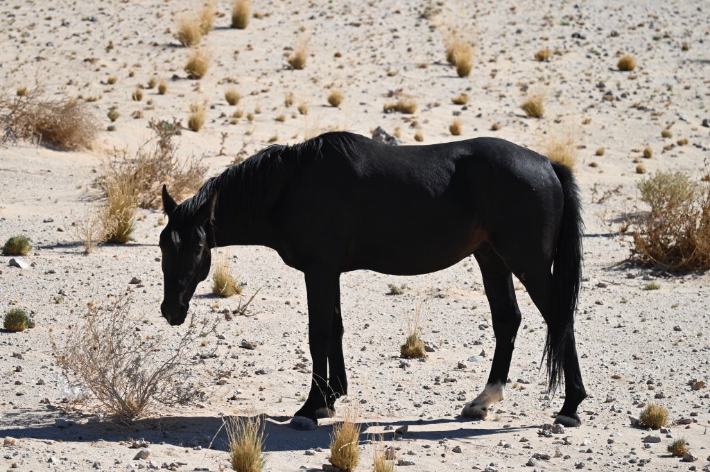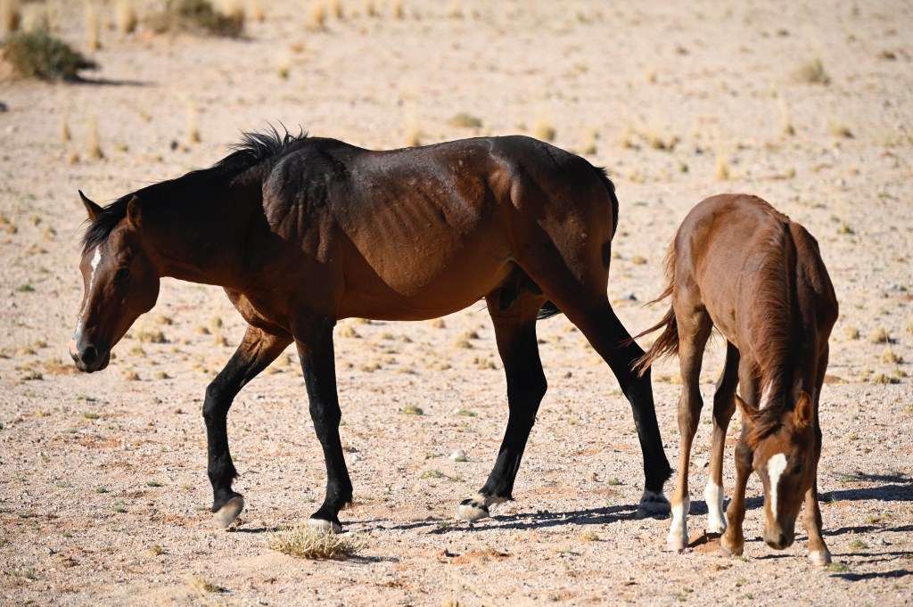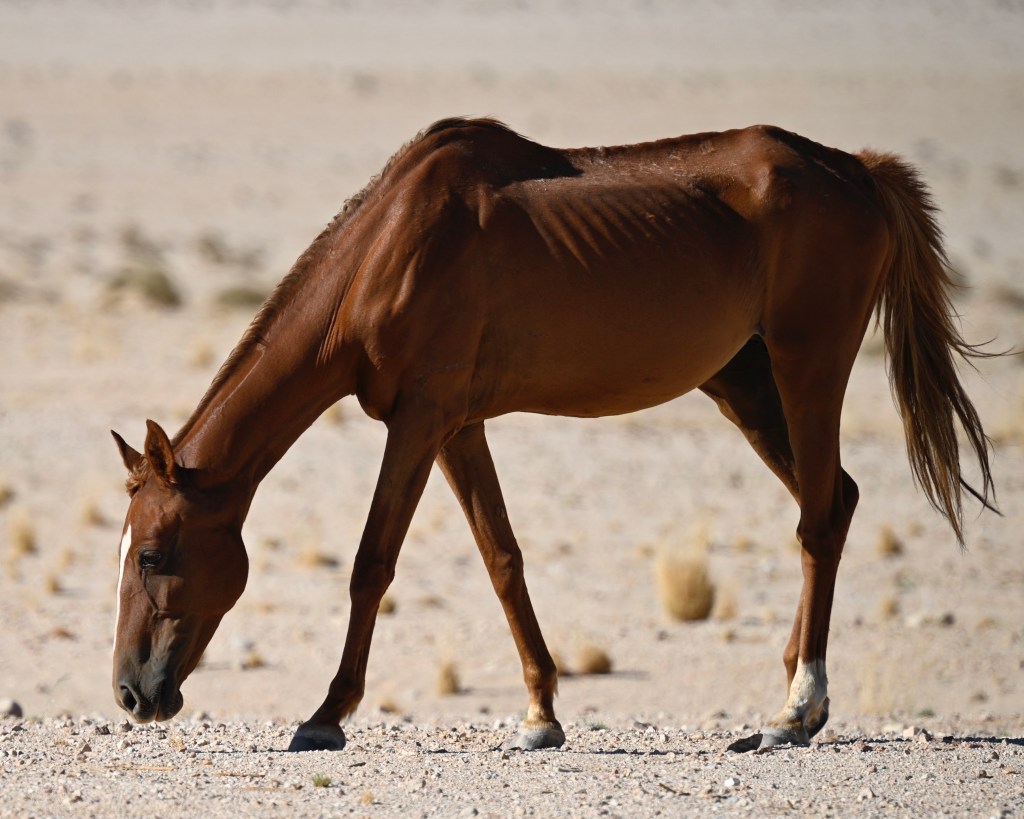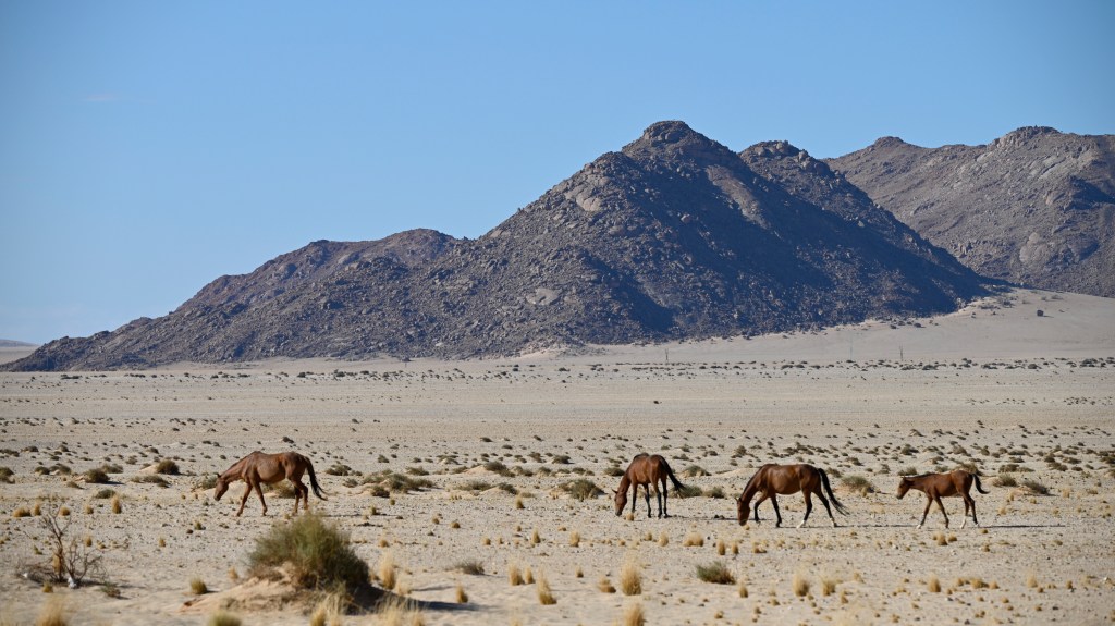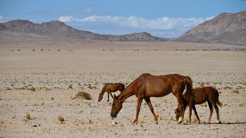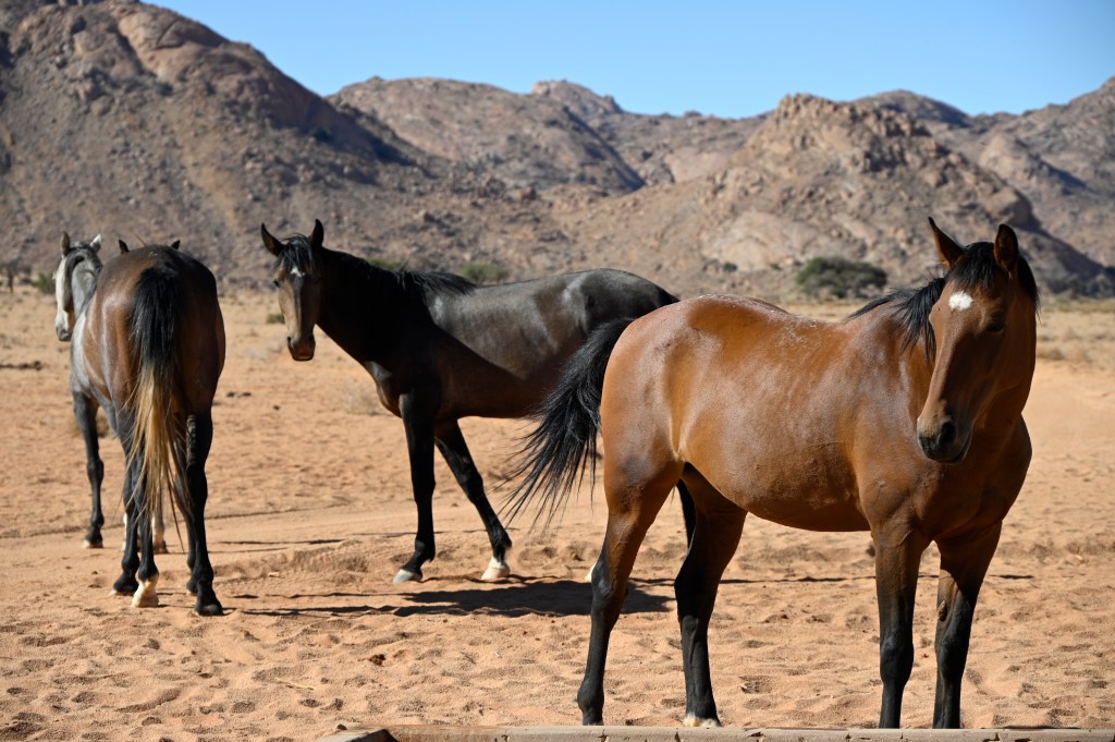 In the southern part of the Namib desert, around Aus, you will find herds of wild horses. Horses would not normally reside in areas with such a dry and warm climate, so they must be imported from somewhere but stories as to where they come from are diverse. The stories range from those about a baron at Duwisib castle, from diamond explorations and to being imported as war horses. Anyway, have the horses survived the harsh conditions for more than a century, found their place and is beautiful to look at.