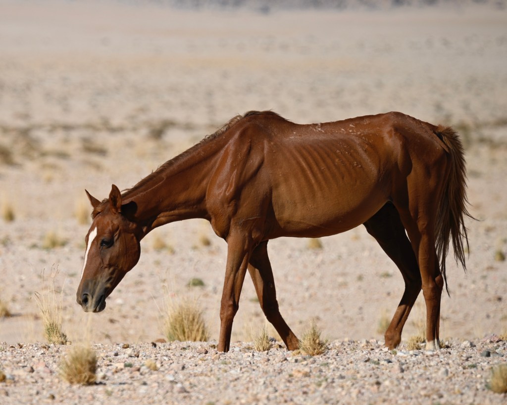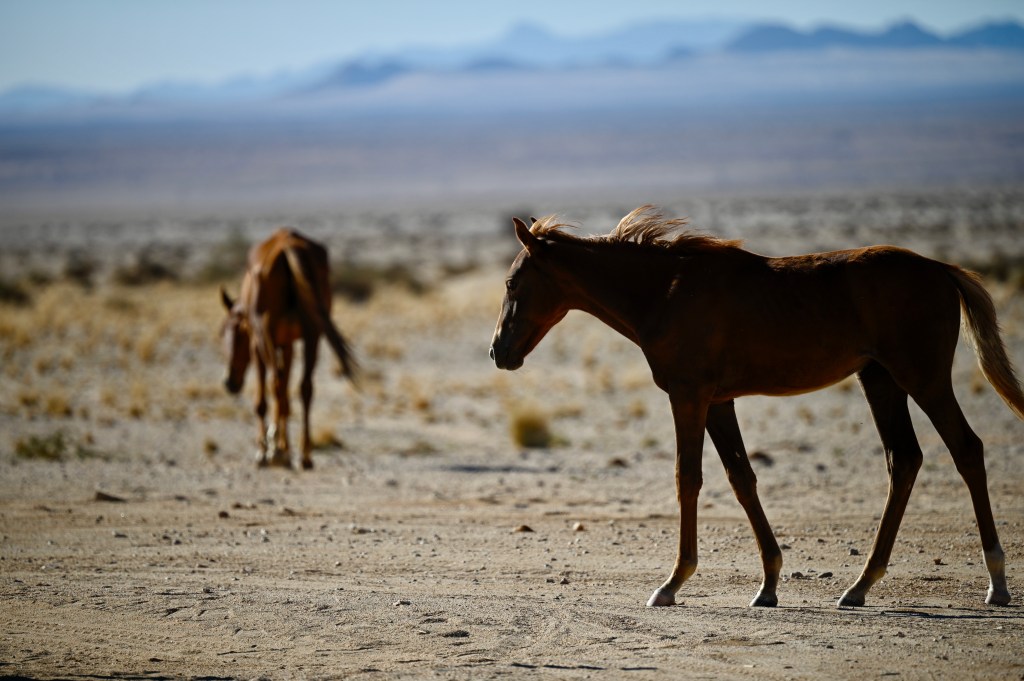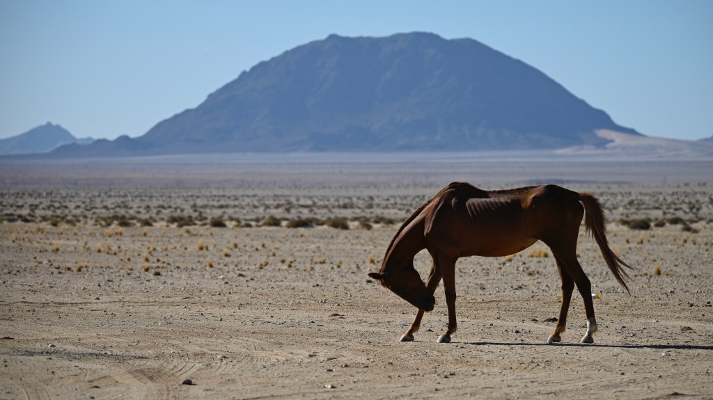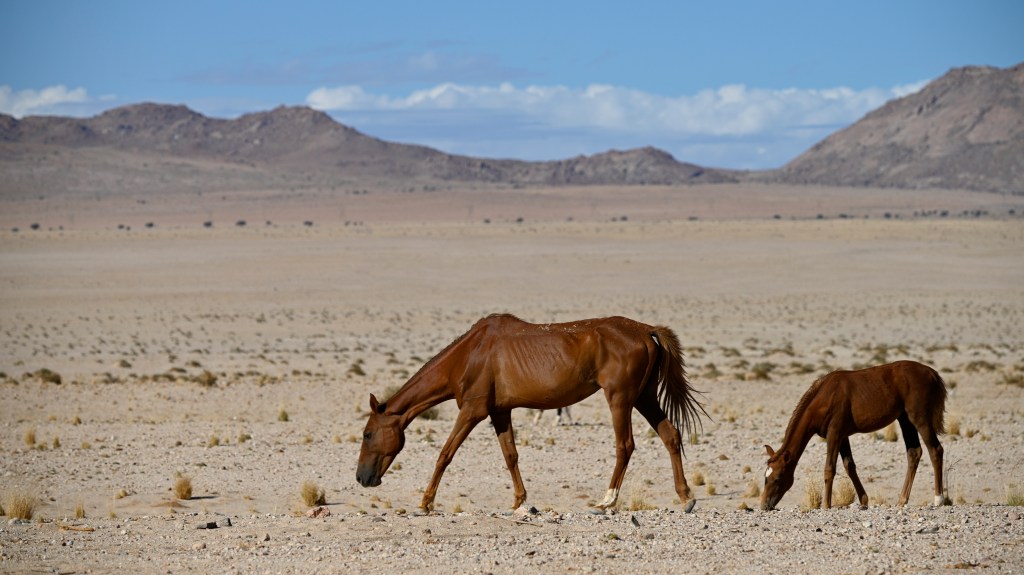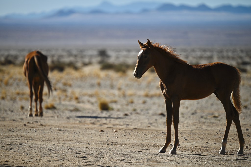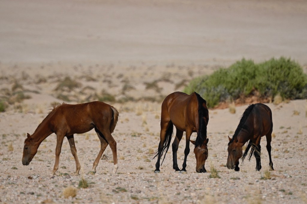 In the southern part of the Namib desert, around Aus, you will find herds of wild horses. Horses would not normally reside in areas with such a dry and warm climate, so they must be imported from somewhere but stories as to where they come from are diverse. The stories range from those about a baron at Duwisib castle, from diamond explorations and to being imported as war horses. Anyway, have the horses survived the harsh conditions for more than a century, found their place and is beautiful to look at.