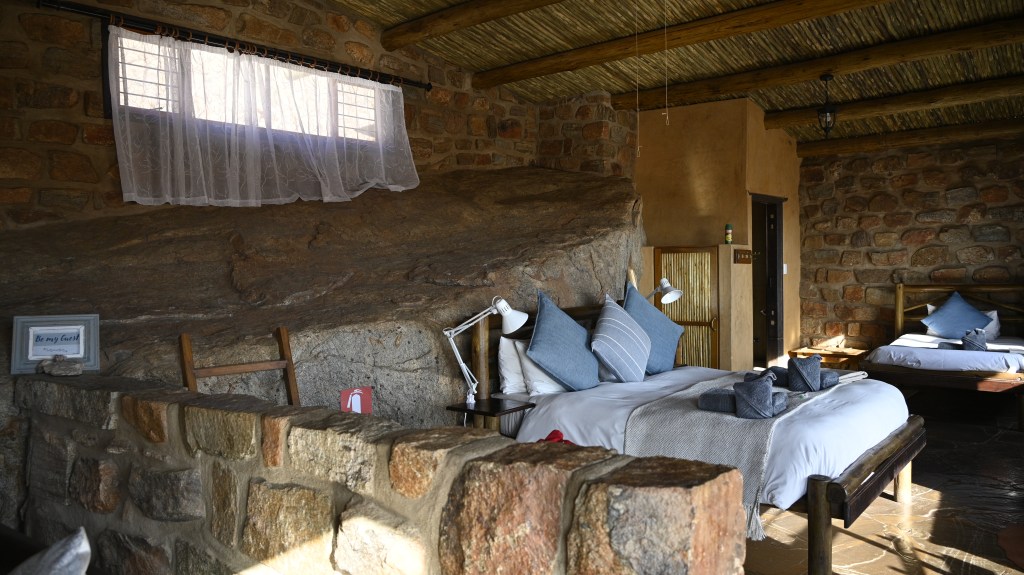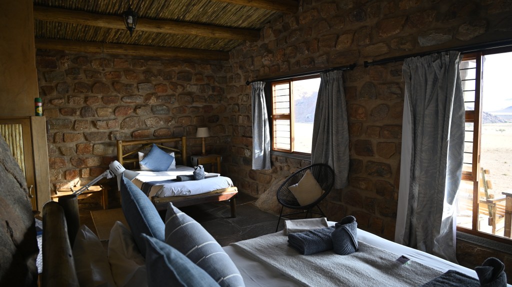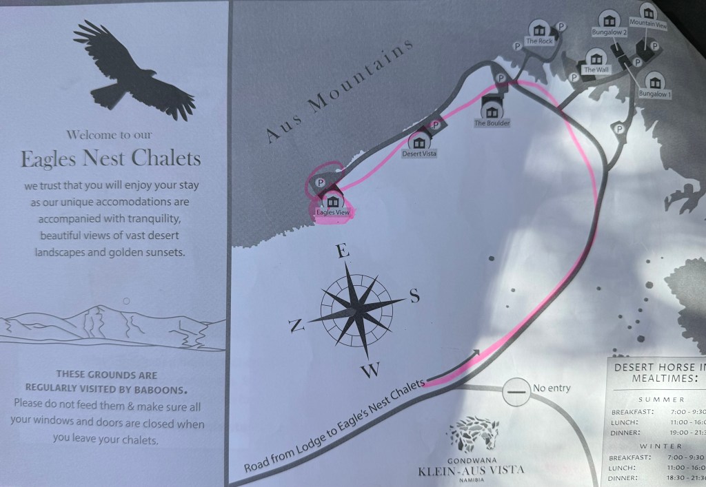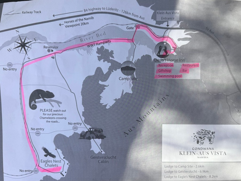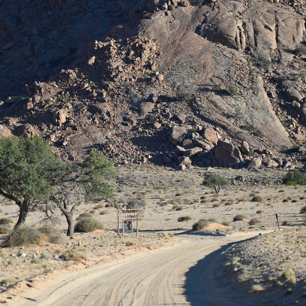 Previously we used to live in the rustic Geister Schlucht cabin, inside a narrow valley, with self catering, but this time we stayed at the Eagles nest chalets, with breakfast at the restaurant at Desert horse inn included. To get there, we drove in a sandy road, alongside horses trees and sand up to the edge of the Aus mountains, where the cabins almost were lost of the eye, being built of the same rocks as the landscape surrounding them.