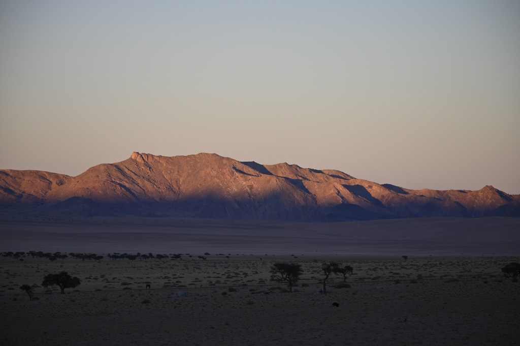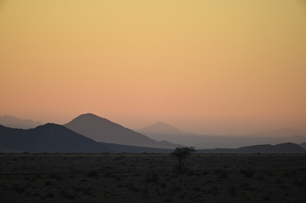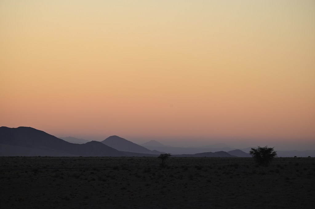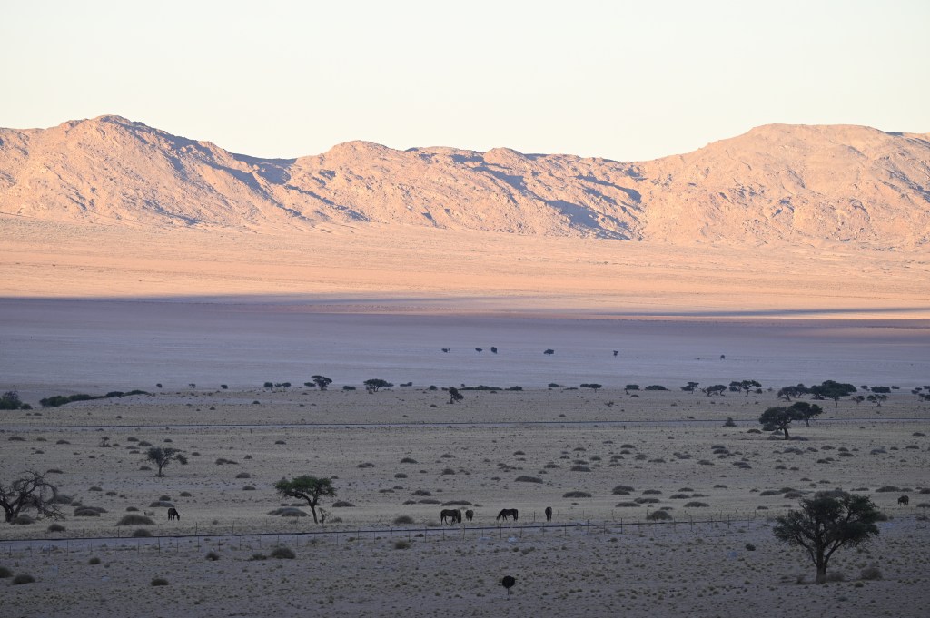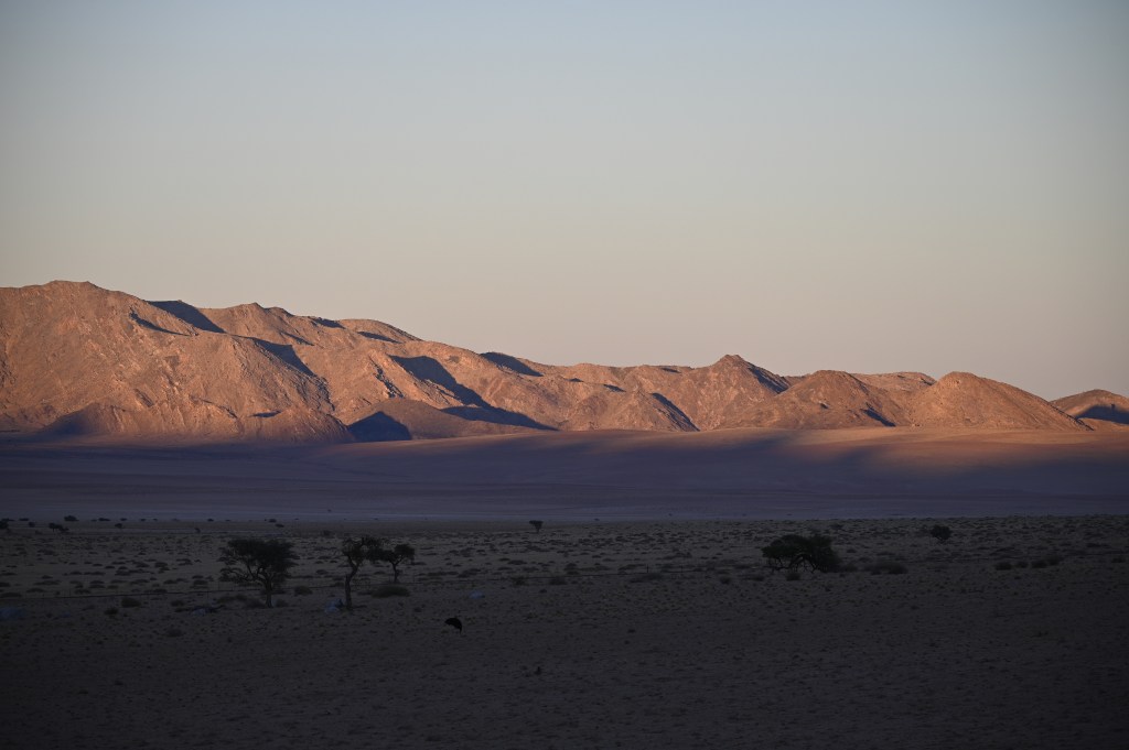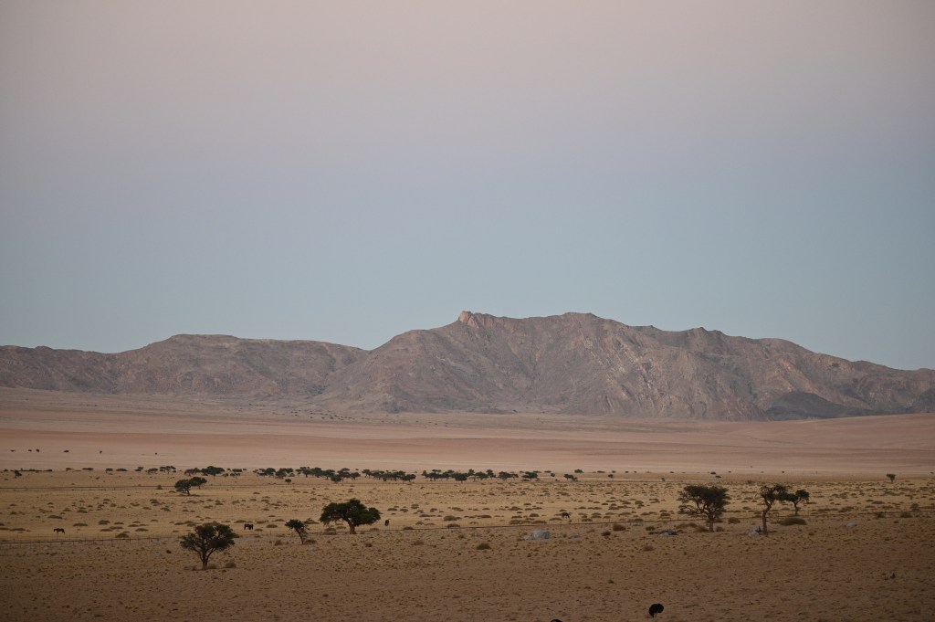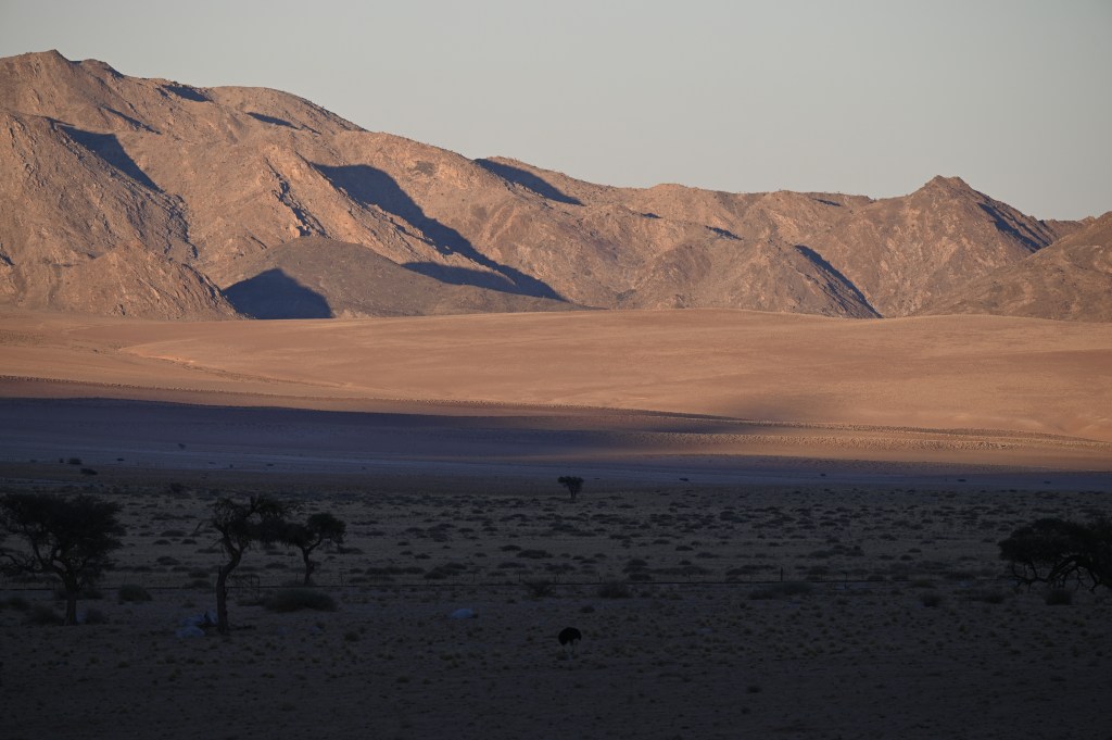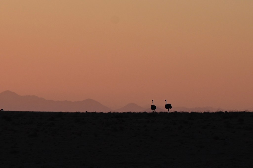 We could also order “braii and breakfast packets”, so that we could barbecue at the cabin in the evening and watch the stars rise instead of driving home from the restaurant in the dark. That also gave the opportunity of having a lazy morning at the cabin, looking at the landscape, watching birds, ostriches, horses and sandy slopes towards the mountains, while the sun colored the landscape.