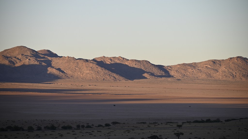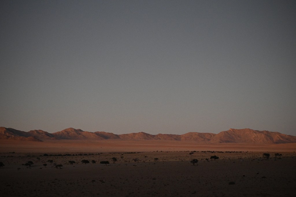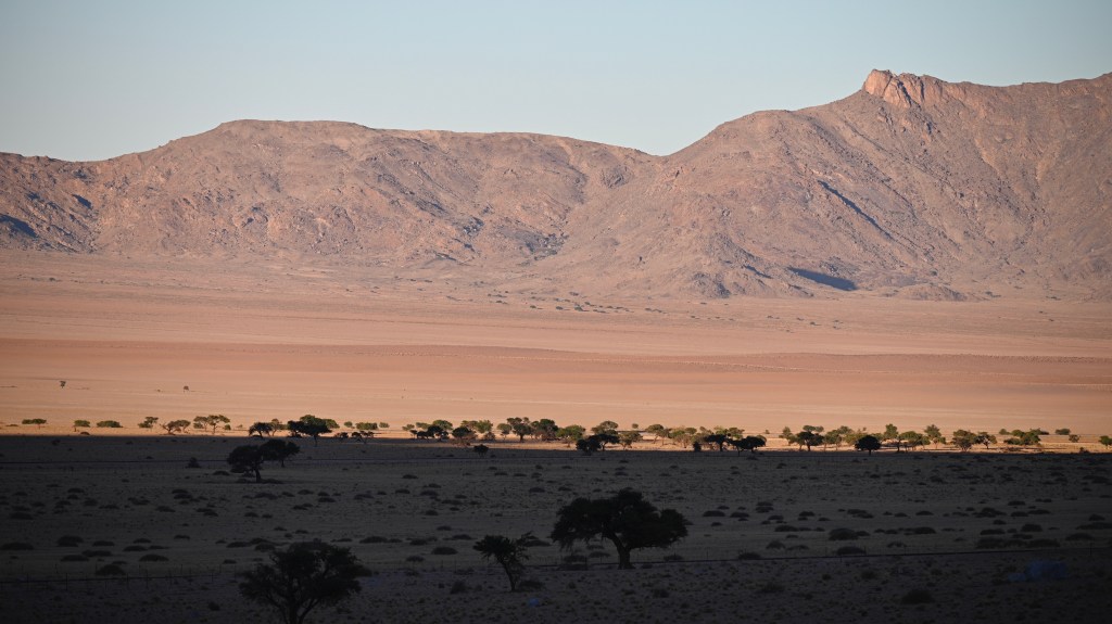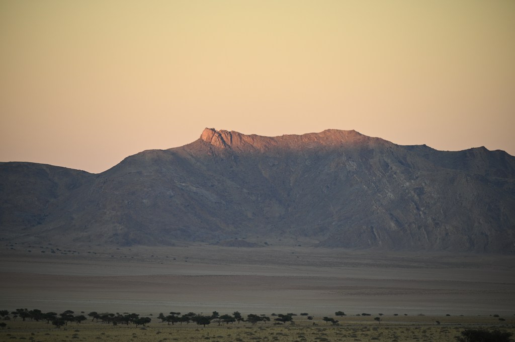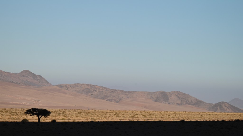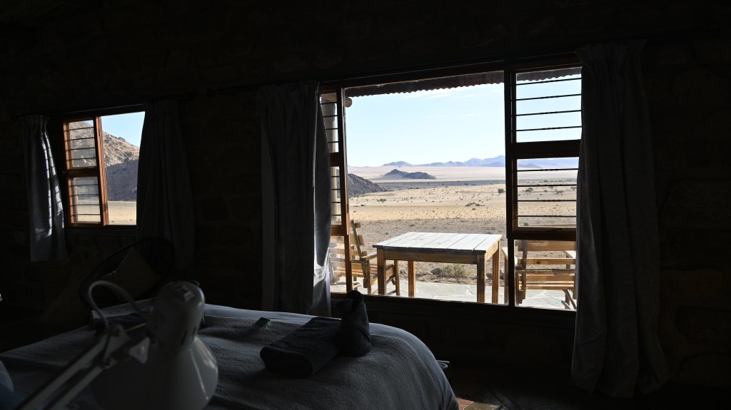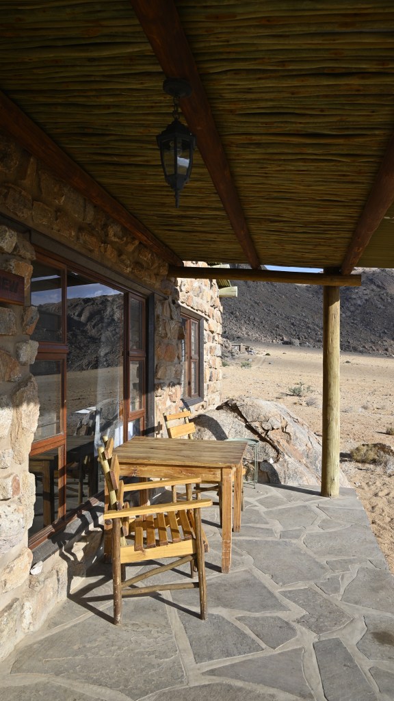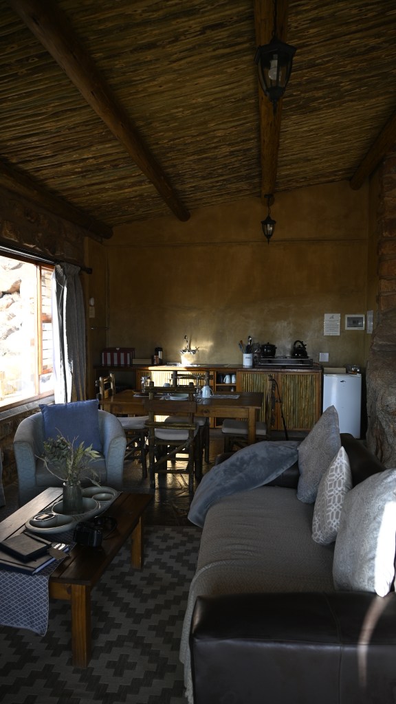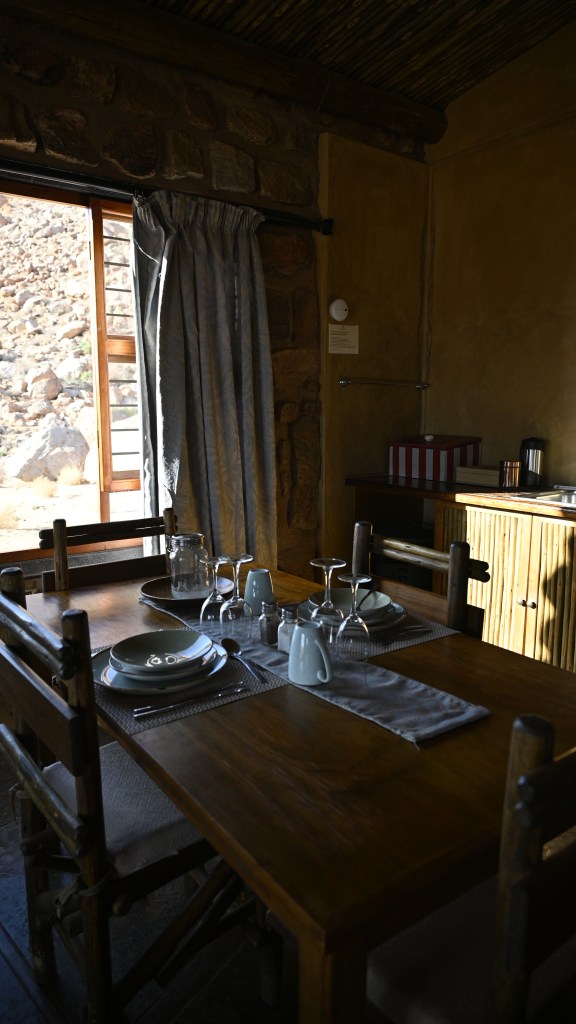 We could also order “braii and breakfast packets”, so that we could barbecue at the cabin in the evening and watch the stars rise instead of driving home from the restaurant in the dark. That also gave the opportunity of having a lazy morning at the cabin, looking at the landscape, watching birds, ostriches, horses and sandy slopes towards the mountains, while the sun colored the landscape.