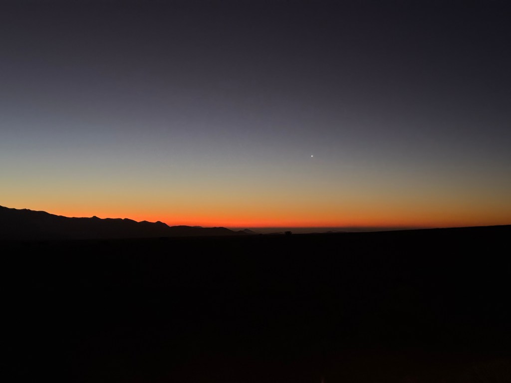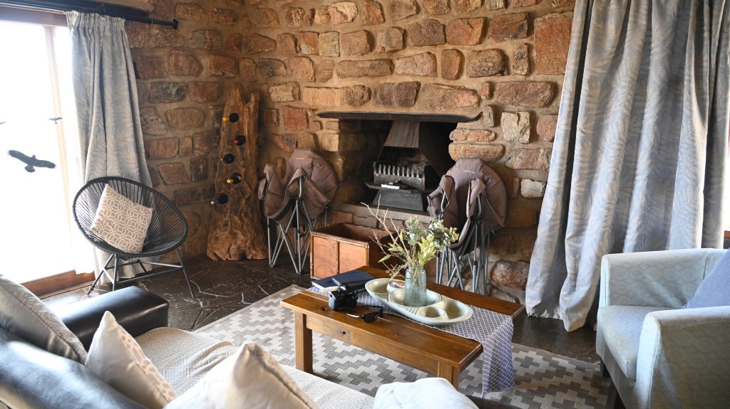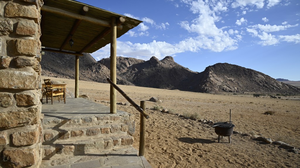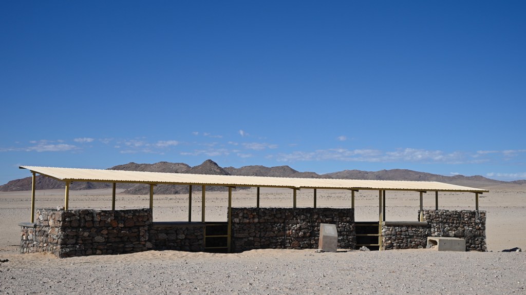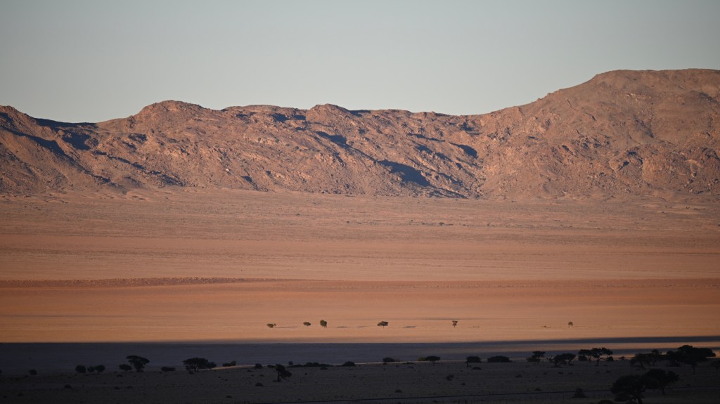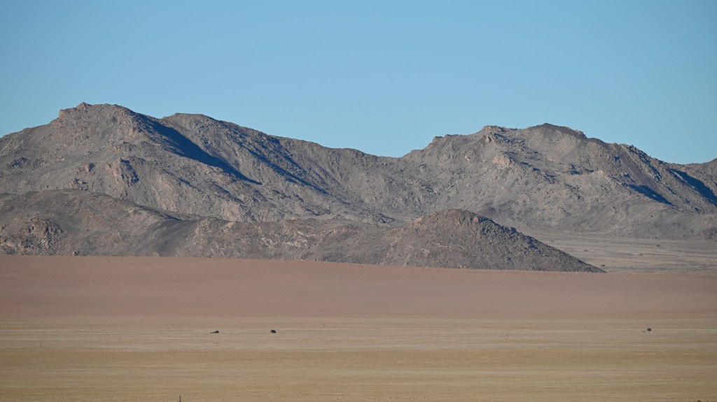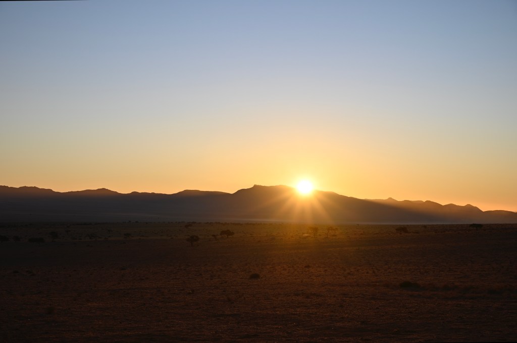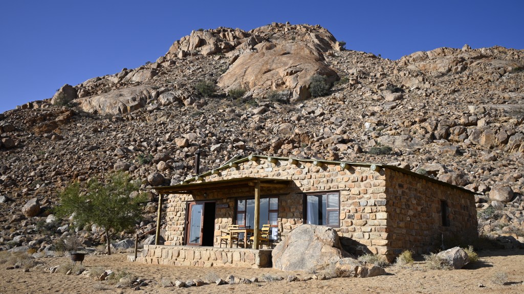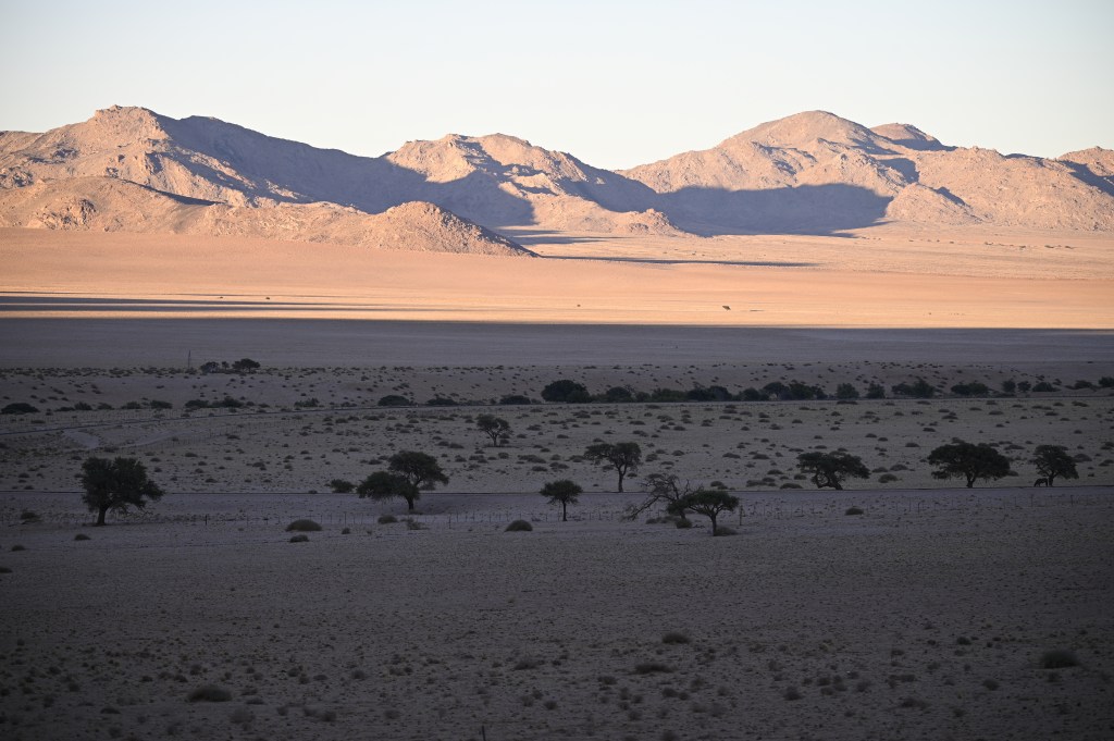 We could also order “braii and breakfast packets”, so that we could barbecue at the cabin in the evening and watch the stars rise instead of driving home from the restaurant in the dark. That also gave the opportunity of having a lazy morning at the cabin, looking at the landscape, watching birds, ostriches, horses and sandy slopes towards the mountains, while the sun colored the landscape.