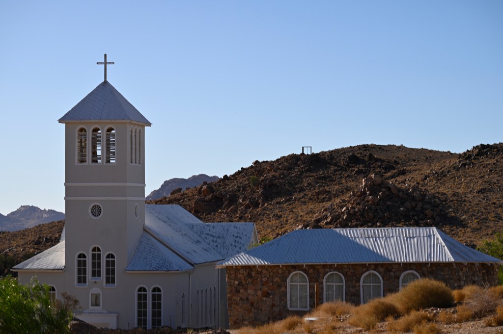 The small settlement of Aus is quite nice. It has a petrol station, a small hotel, a church and some houses. It also has some remarkable rocky cliffs, looking like the side of a face, with a nose, chin and cheeks. A real landmark, when seen from the mainroad towards Lűderitz on the way from Keetmanshoop.