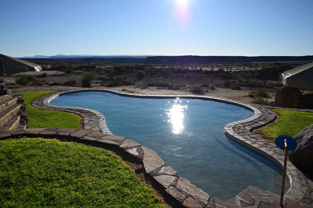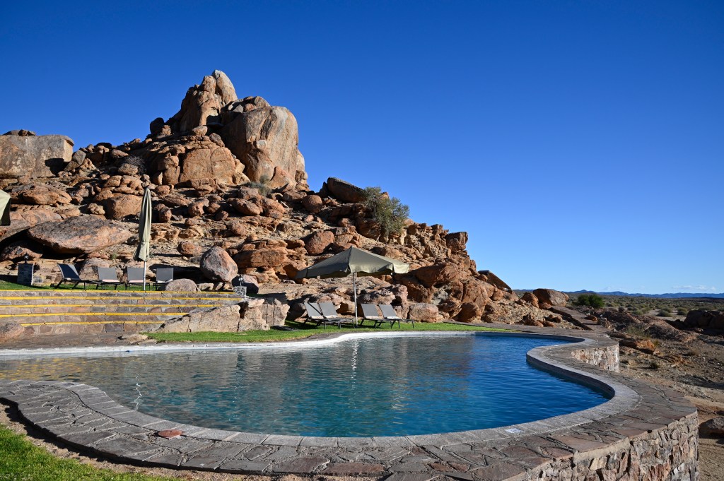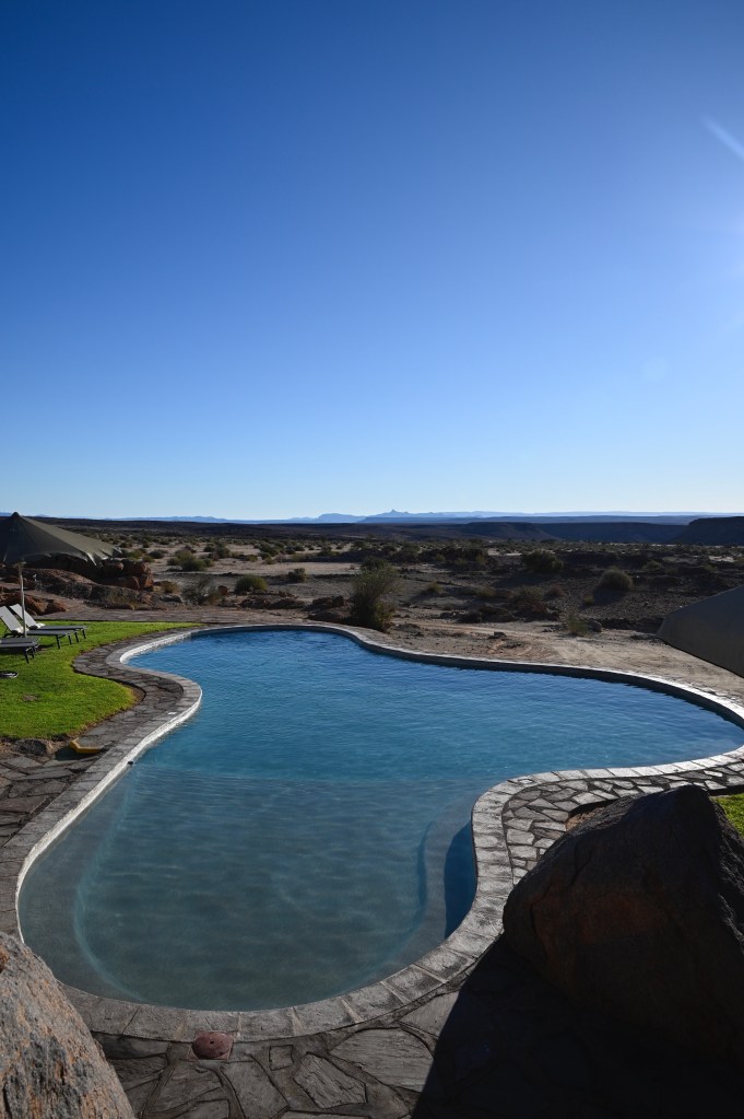 Godwana Canyon Lodge is “The best” place to live when you visit Fish River Canyon. Not because it’s closest, but just because it’s a wonderful place. I visited 26 years ago and in 2025, and it’s still the same! But upgraded. The cabin among the red granite cliffs, with oryxes and daisies walking right outside, the service, the glittering pool and not least the wonderful sunset over the granite boulders. All reminding of the trip I had with my father and then 2-year old son back in 1997. It was still wonderful in 2025, even in the companionship of some Russians ladies with high-healed cowboy outfits. The sunset was still the same and I celebrated the return with a Tafel lager, even though I normally do not drink beer.