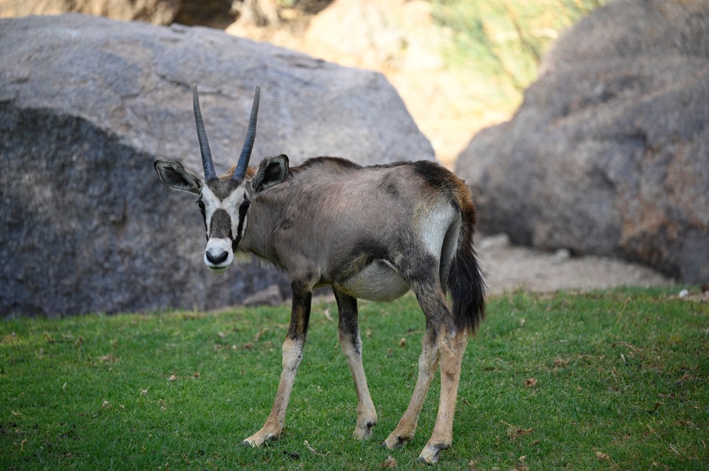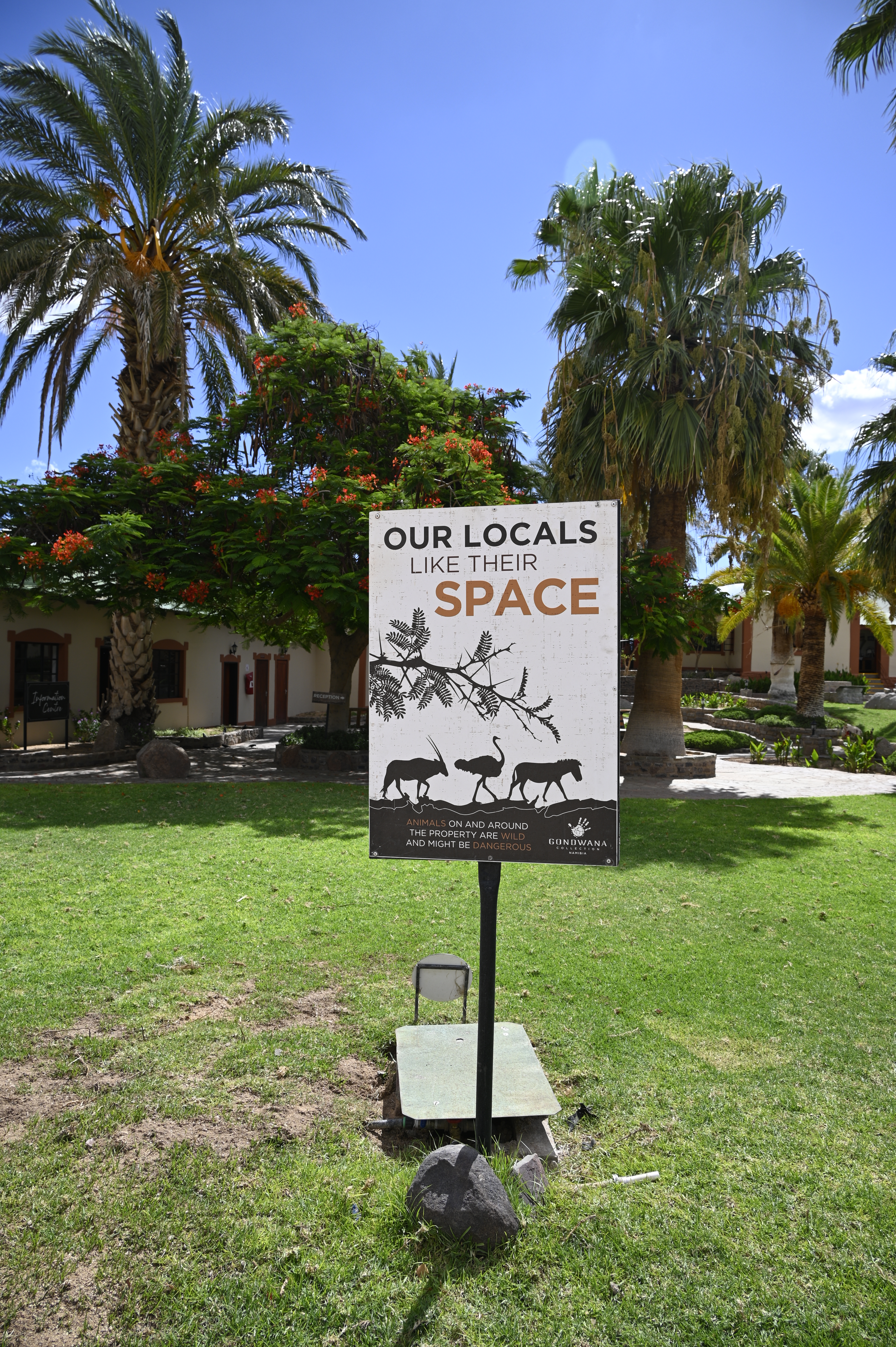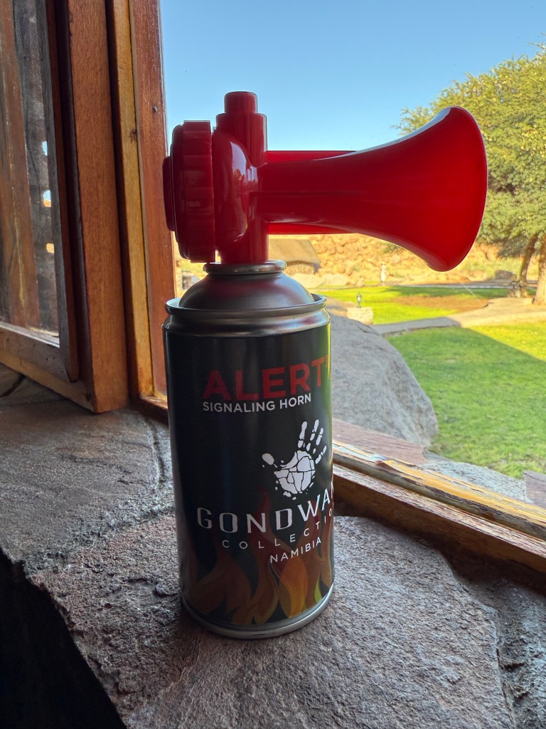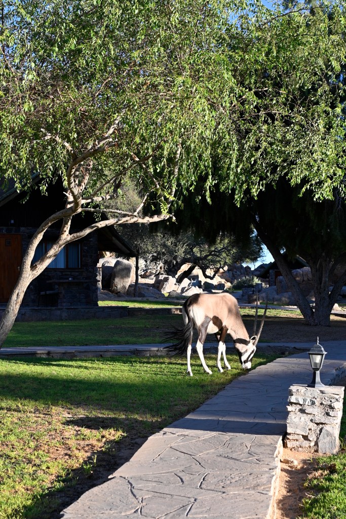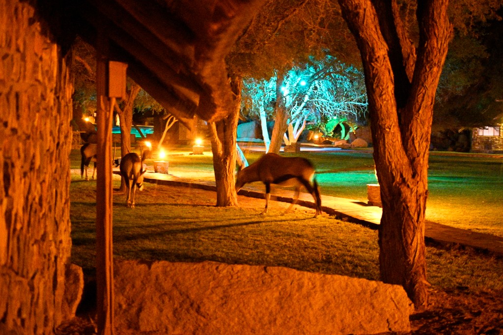 Going back to the cabin in the evening, after a good buffet dinner, gave me a little fright. Outside our cabin was oryxes grazing, peacefully, but still we had to pass their baby to get to our place. And their spears on the heads are straight, long and fearful. We just had to wait and go in circles around to not interfere. They moved away slowly, as we found the door to our place and thereafter we got to see the night stars. Later on we found a signal horn in our room. To warn if we were in danger.