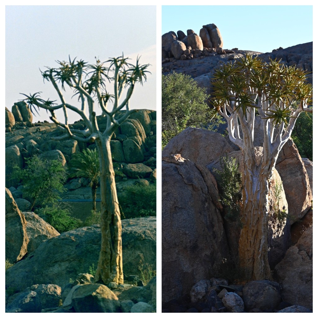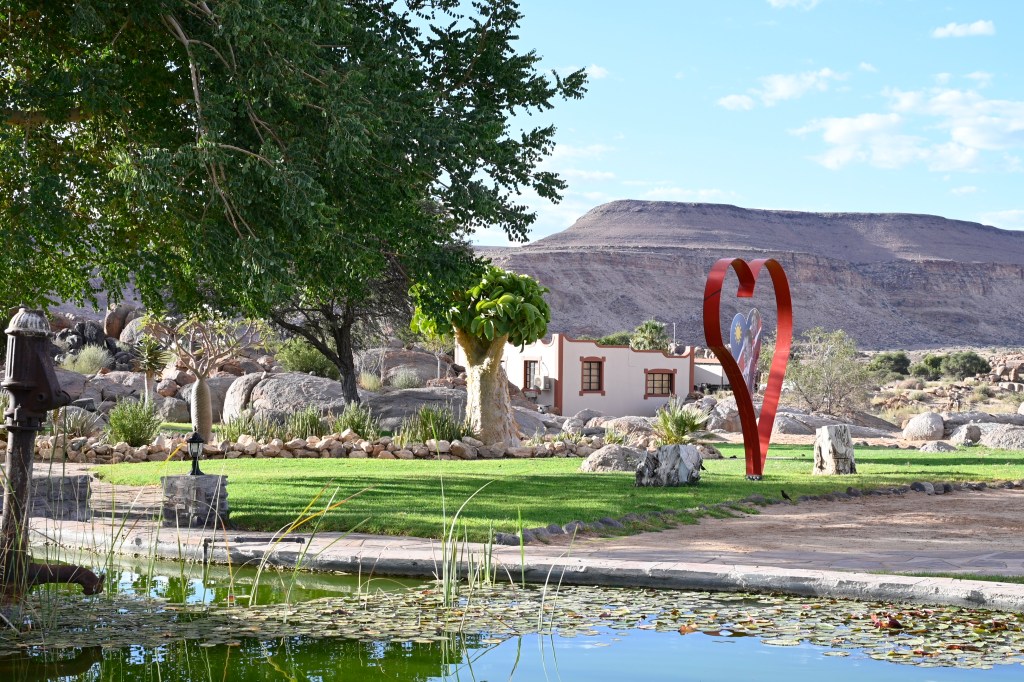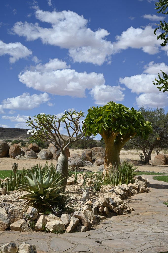The gardens at Canyon lodge is really beautiful. It was something with the rock formations that allowed water to stay in this place and the had a natural well, that had been there for ages. A Quiver tree (Kokerboom) which was there 26 years back was still there, only a little bit wide and taller. We were told that they could live for 300 years. The reason for the name was that the inner stem of the tree is hollow and this part could be used to carry quivers. The tree is located only in this area of southern Africa, and you can see them on the driest places, often on top of or on the side of a rocky mountain. Outside of Keetmanshop, there is an are with many of these trees, called Quiver Tree Forest, which we have visited a couple of times. Eight years back, my husband visited the place and brought me some seeds, which have grown very well in my living room, i now thus have a little “quiver tree forest” in my living room in Norway, and wonder what shall become of these when they grow into large trees.