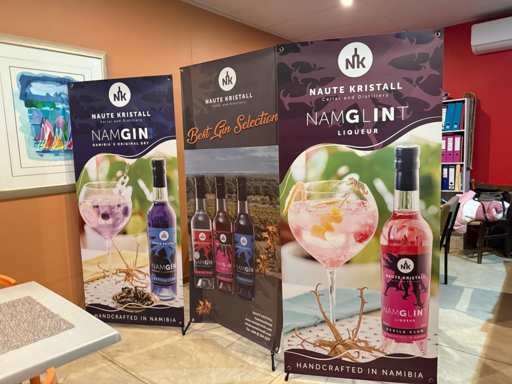 This decision to take the easier road turned out to be a very good choice, especially for my husband, as we found café and gin factory at Naute dam, offering gin tasting for only 80 NAD per person. Naute Kristal Cellar and Distillery is located right below Naute dam and next to a plantation that grows date palms and grapes, which is a rare sight in the else-way dry and arid landscapes of southern Namibia. They use the dates for gin-making and grapes to make a local version of Grappa, which they will call “Nappa” (N for Namibia). The also makes a gin where they use the tubers from the “Devils claw” plant as an important ingredients. Their spirit has won several international competitions. As I was the driver this day, I did not get to taste, but enjoyed toast from home-made bread, the fun of listening to the explanations of the different spirits, watching how the spirit changed it’s colour when lemon was added and not least looking at the wonderful birds in the cafés garden.